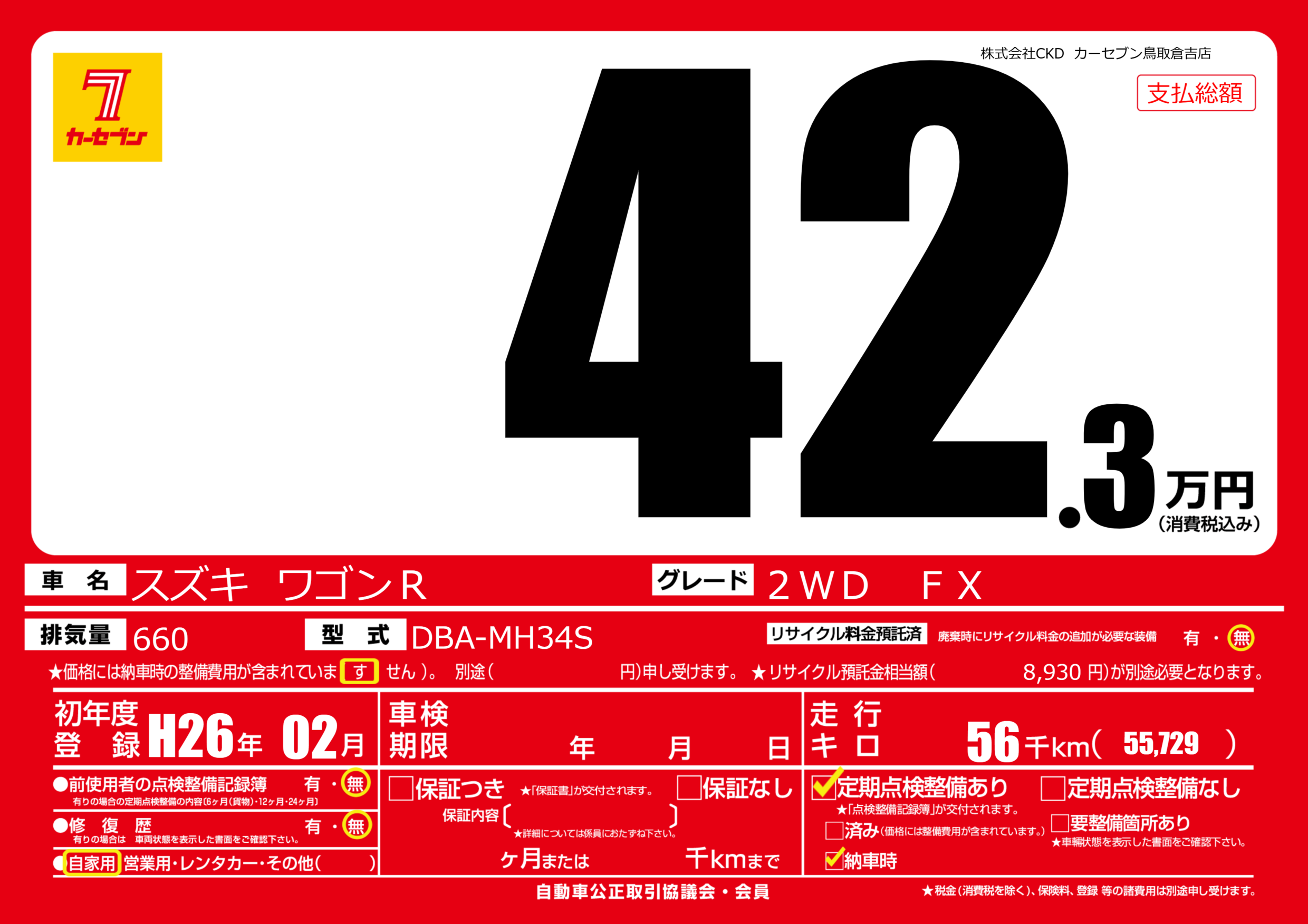 | 車名 | スズキ ワゴンR | グレード ミッション 排気量 |