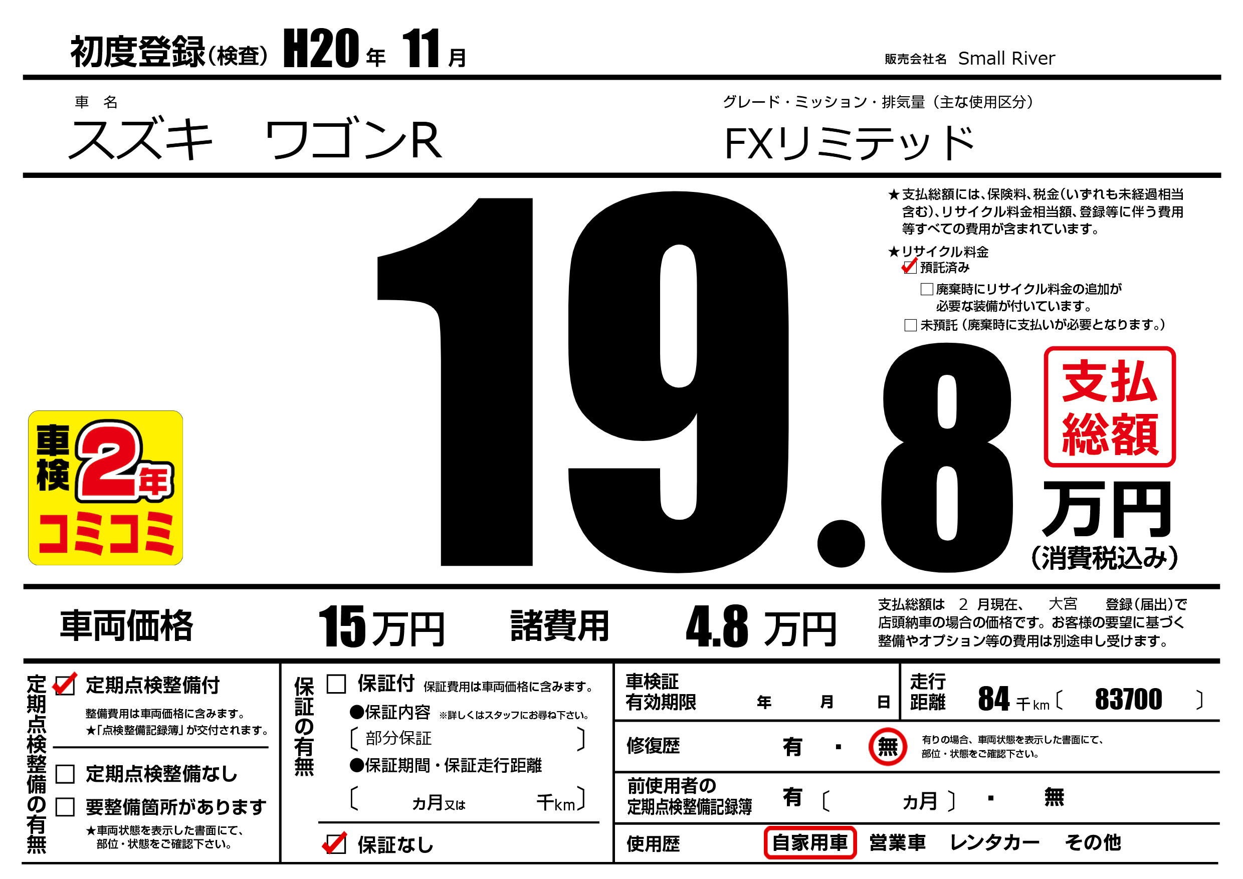 | 車名 | スズキ ワゴンR | グレード ミッション 排気量 |
