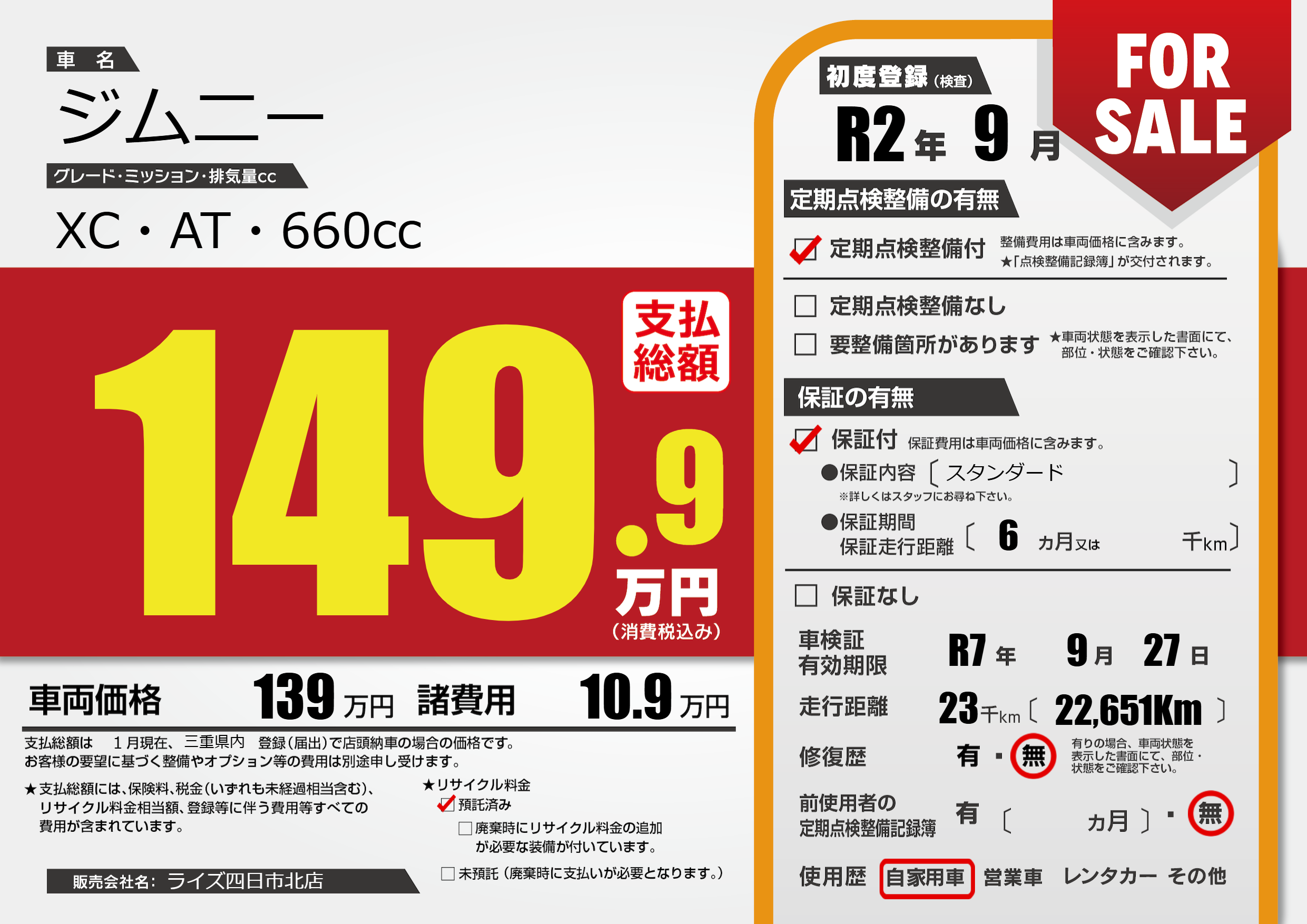 | 車名 | ジムニー | グレード ミッション 排気量 |