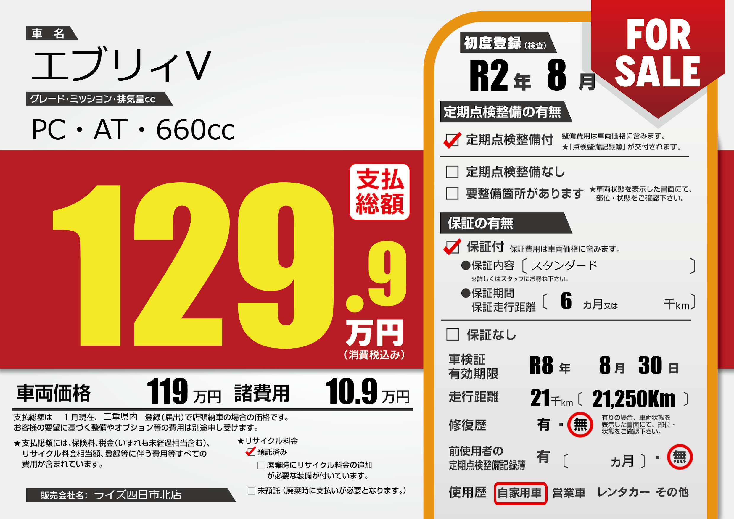 | 車名 | エブリィV | グレード ミッション 排気量 |