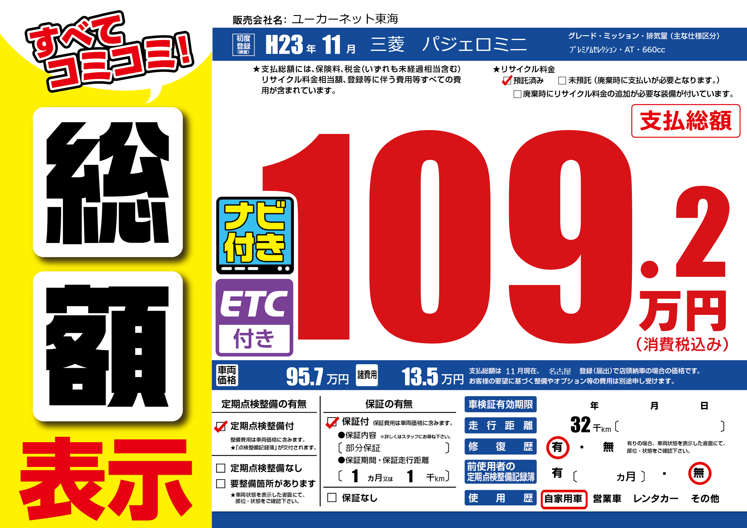 | 車名 | 三菱 パジェロミニ | グレード ミッション 排気量 |