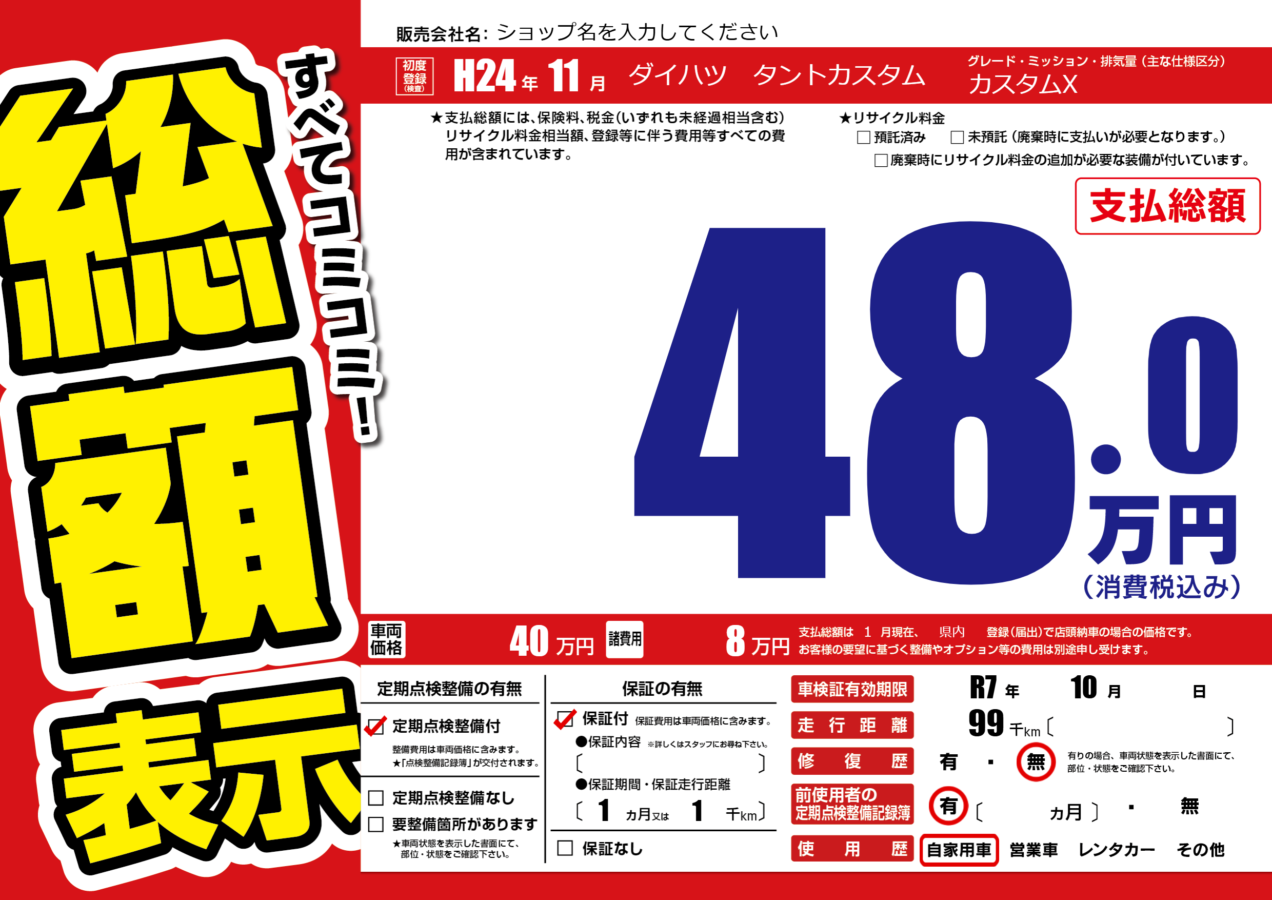 | 車検制限 | R7年 10月 - 日 | ||
