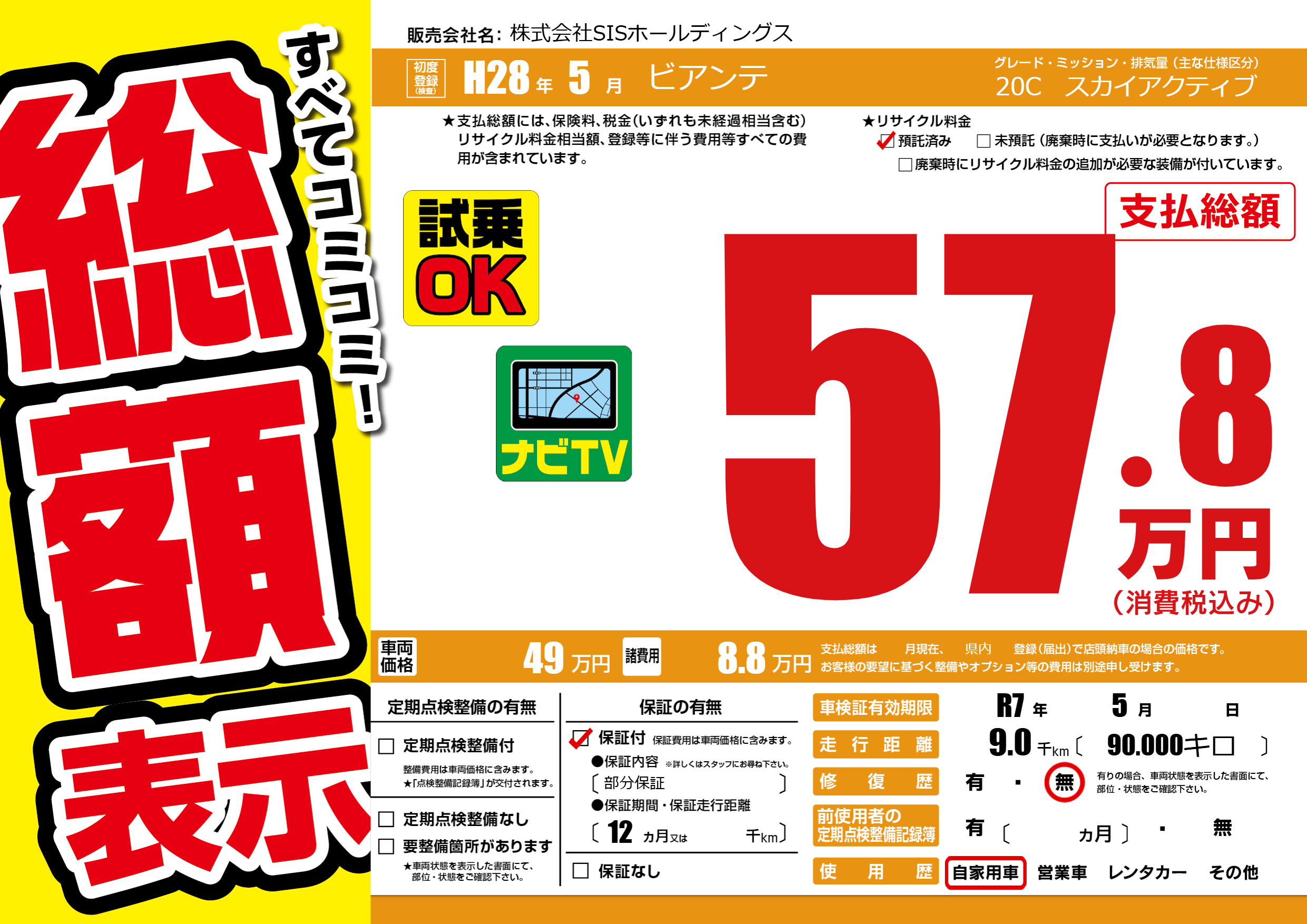 | 車名 | ビアンテ | グレード ミッション 排気量 |