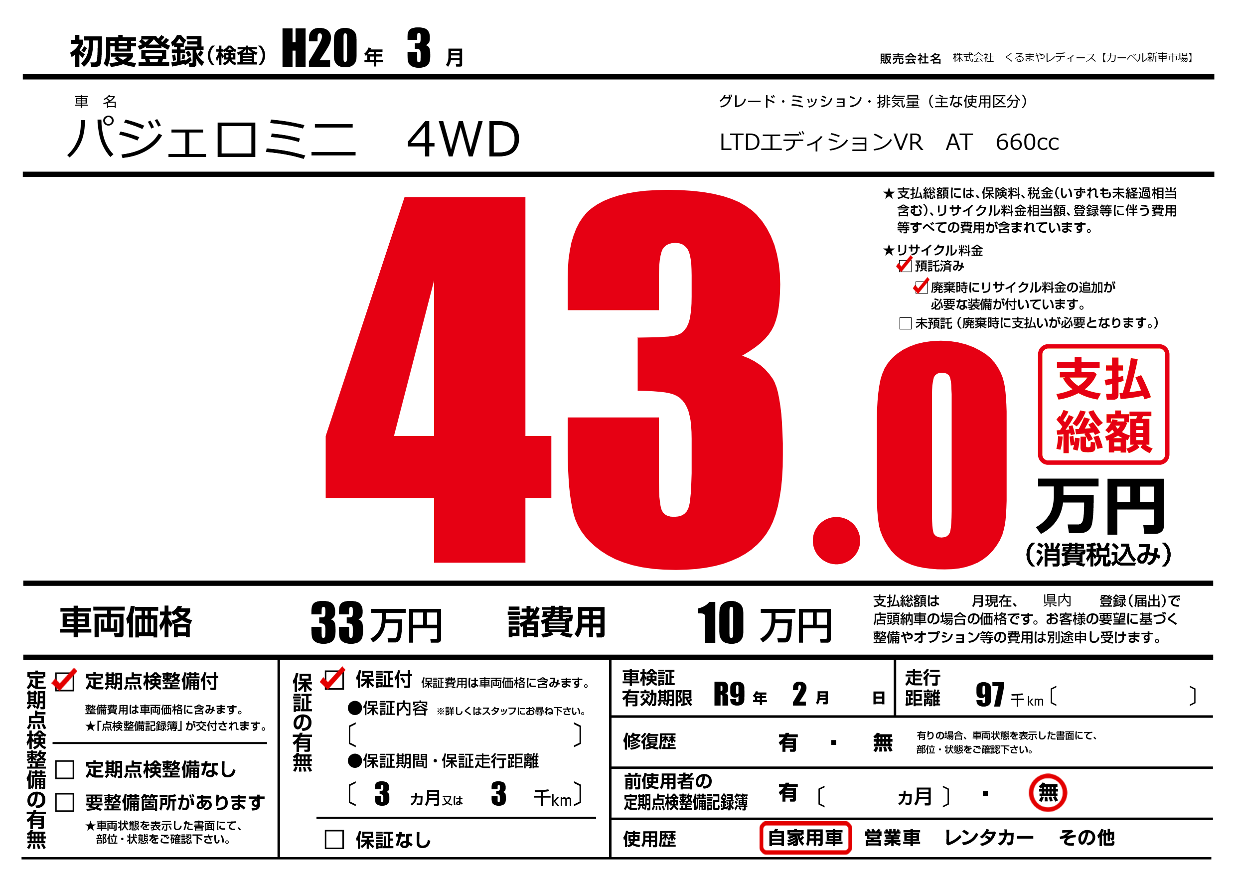| 車名 | パジェロミニ 4WD | グレード ミッション 排気量 |