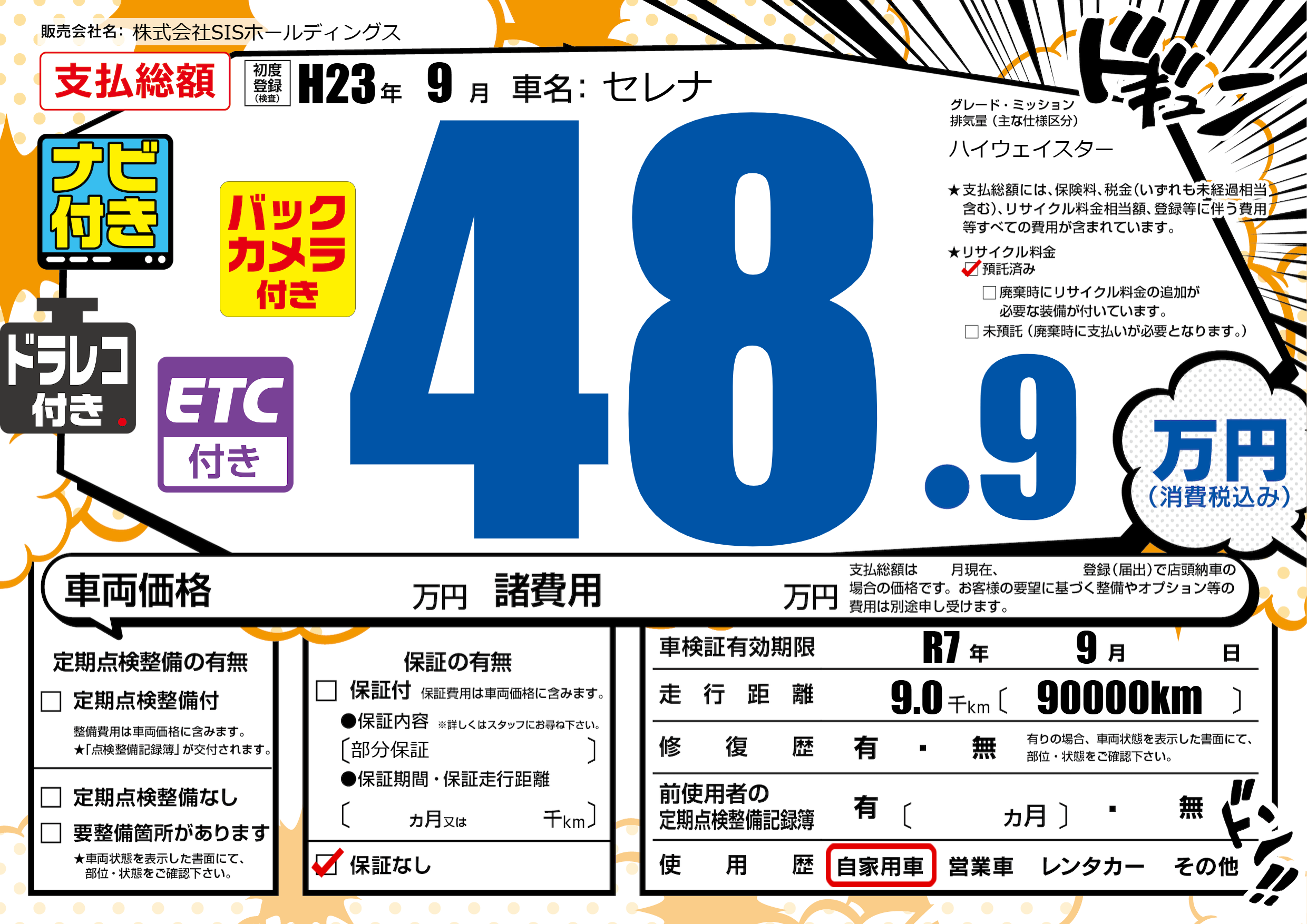| 走行キロ | 0.9万km | 初年度登録 | H23年9月 |