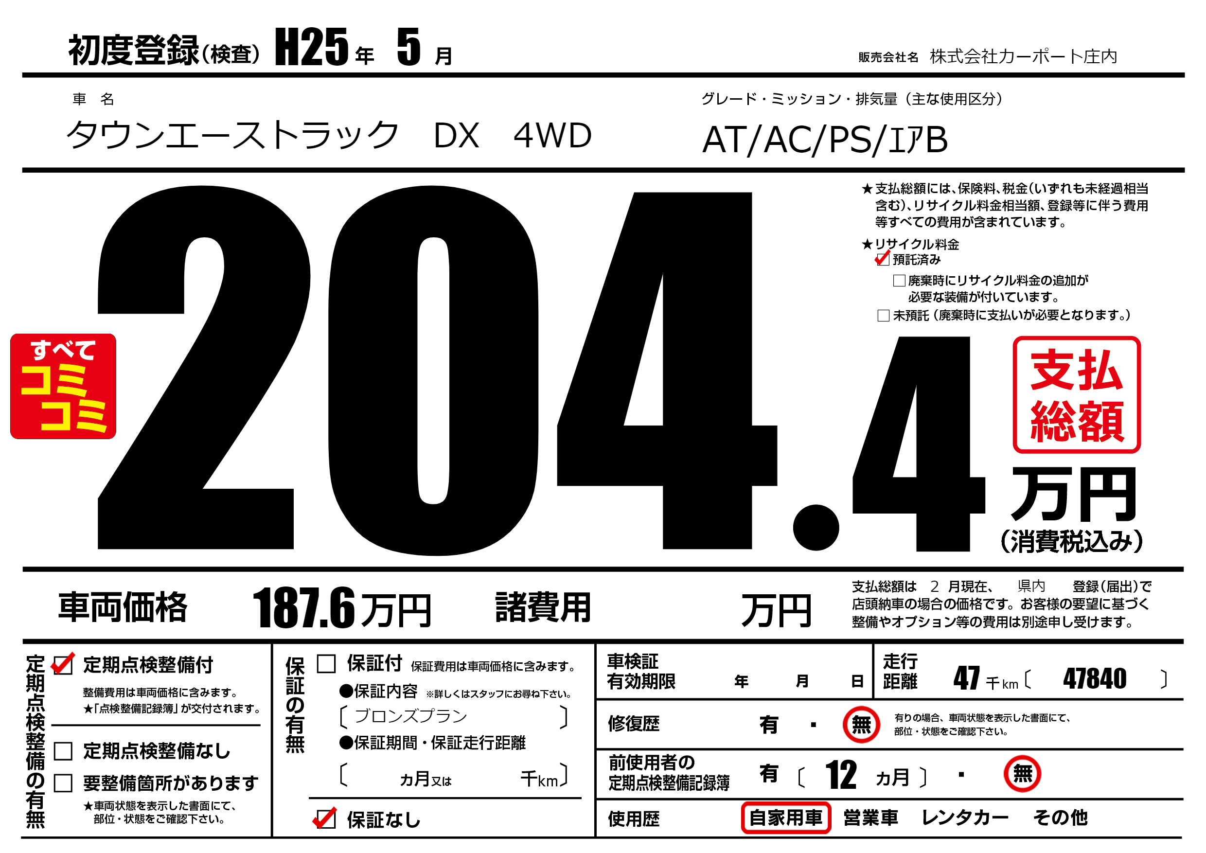 | 車名 | タウンエーストラック DX 4WD | グレード ミッション 排気量 |