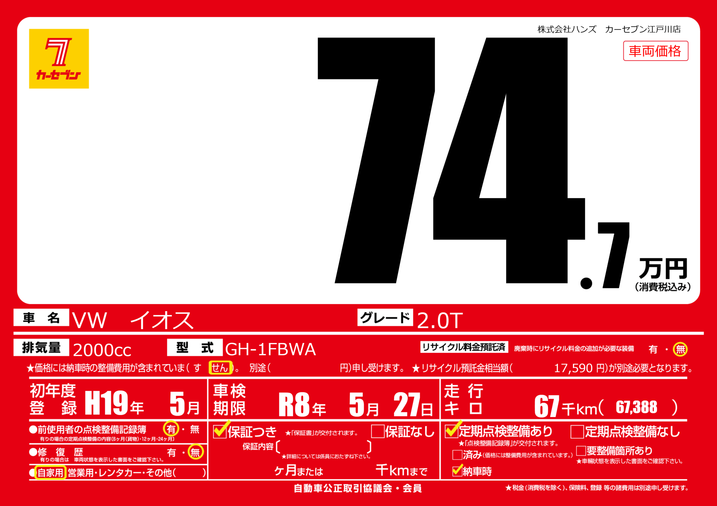| 走行キロ | 6.7万km | 初年度登録 | H19年5月 |