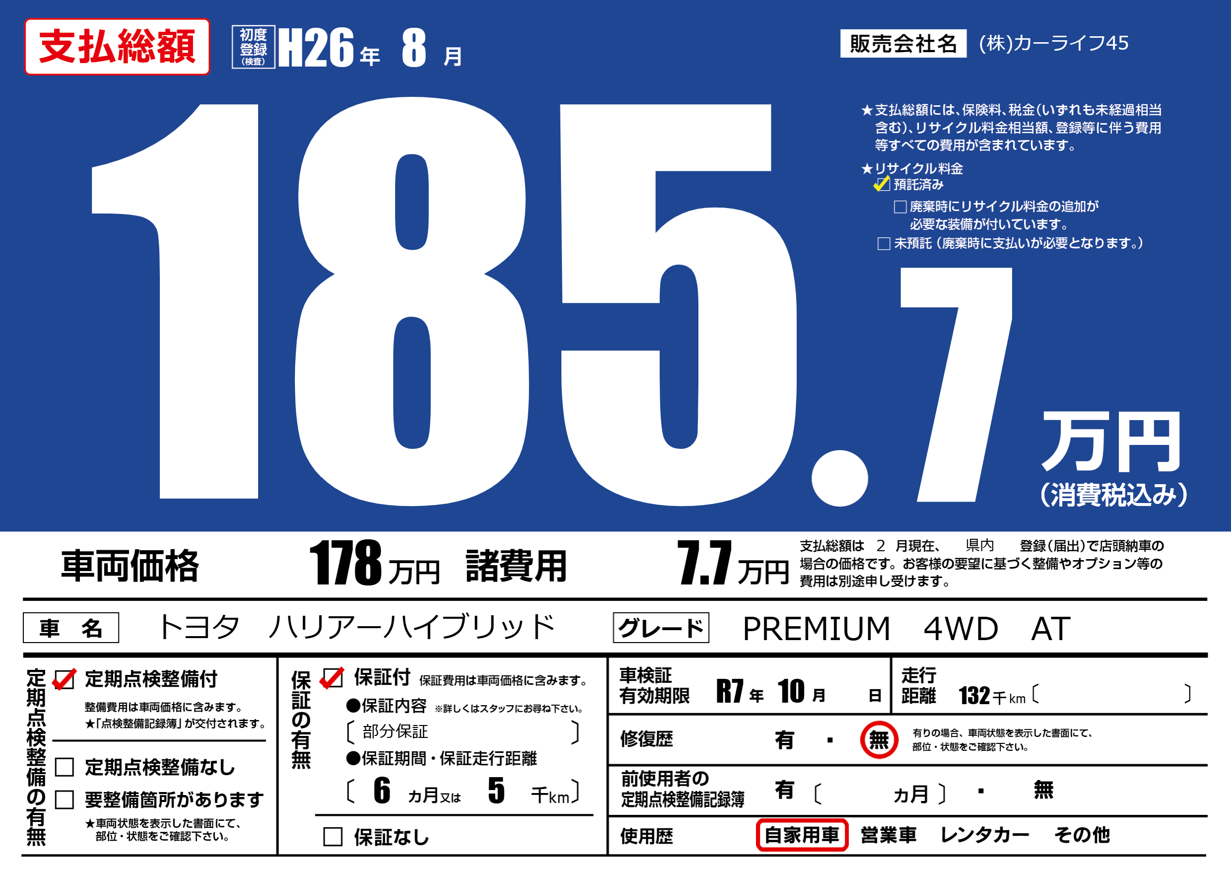 | 車名 | トヨタ ハリアーハイブリッド | グレード ミッション 排気量 |