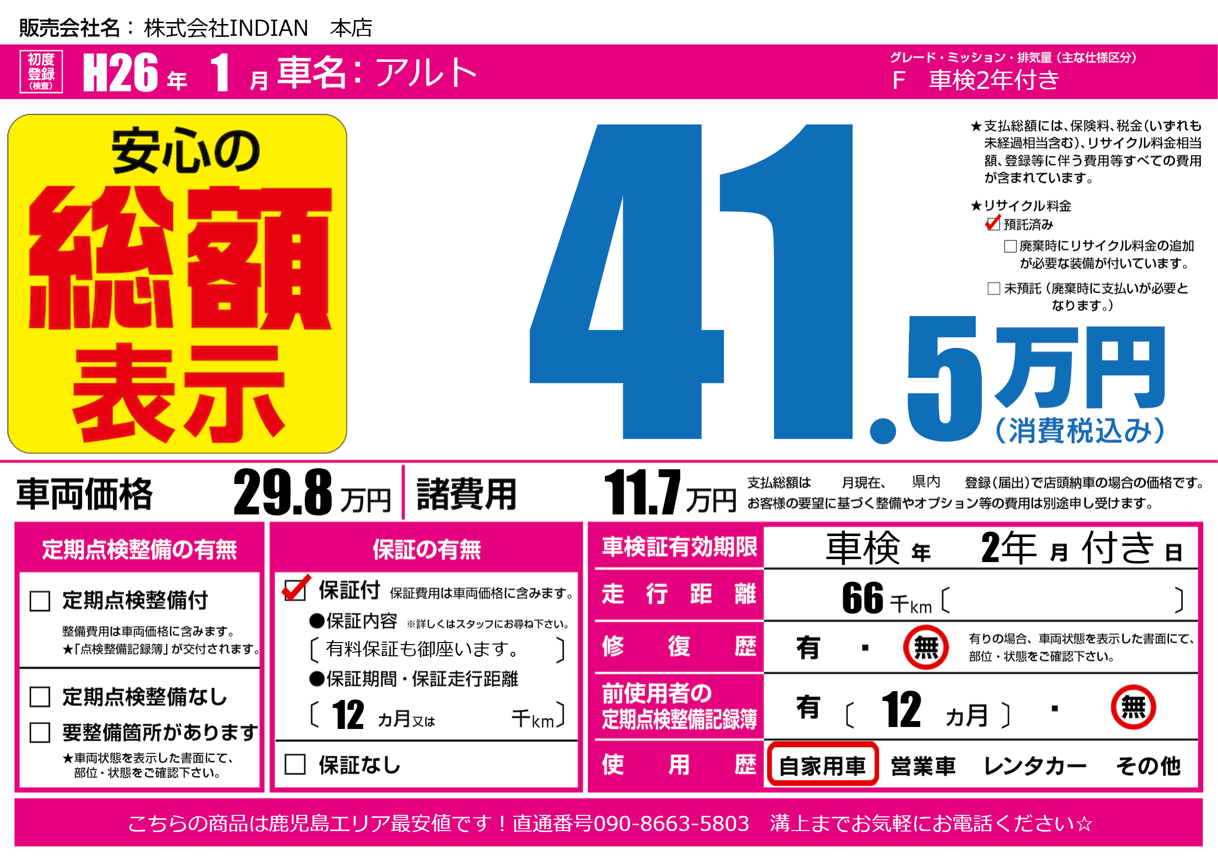 | 走行キロ | 6.6万km | 初年度登録 | H26年1月 |