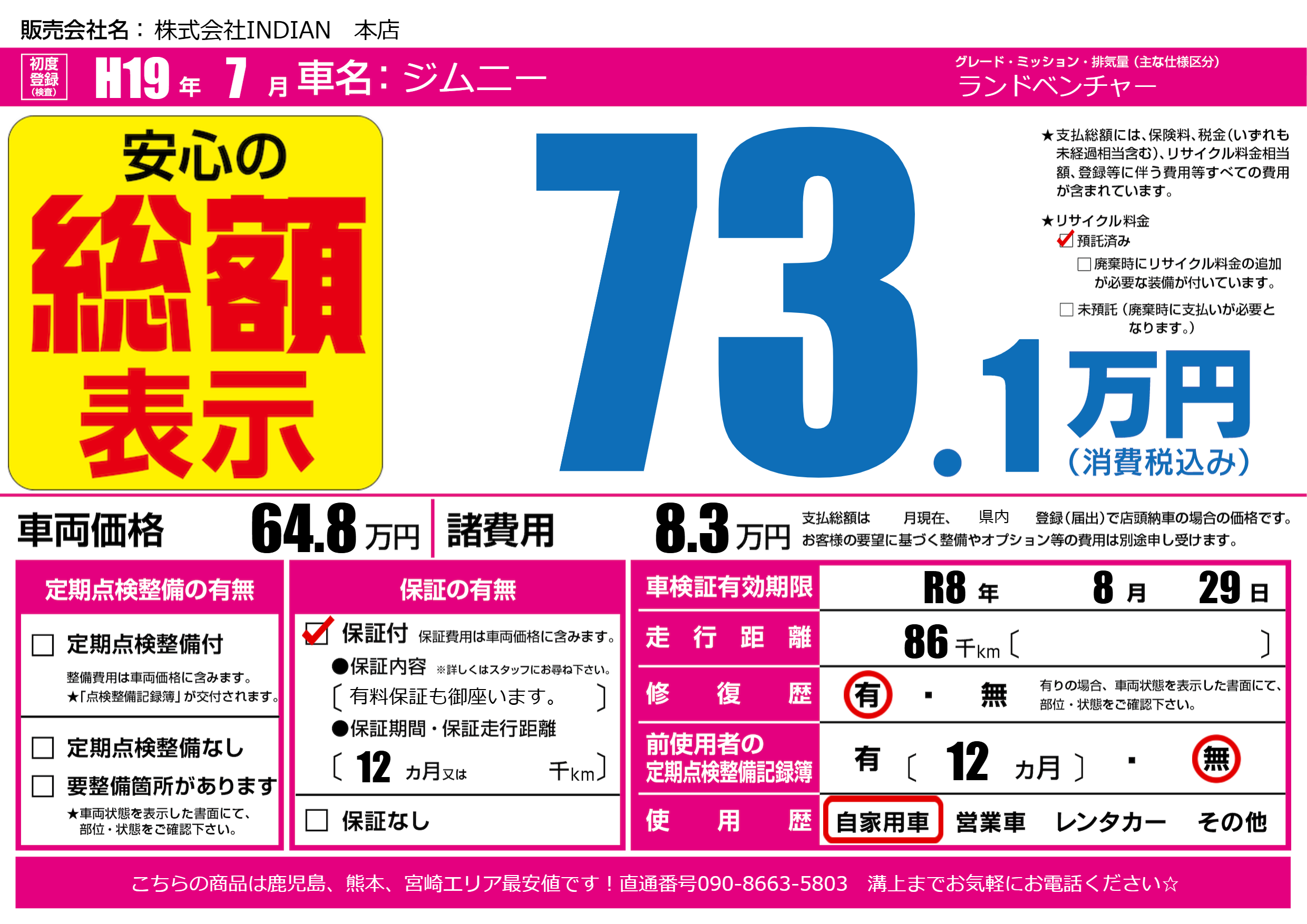 | 車検制限 | R8年 8月 29日 | ||
