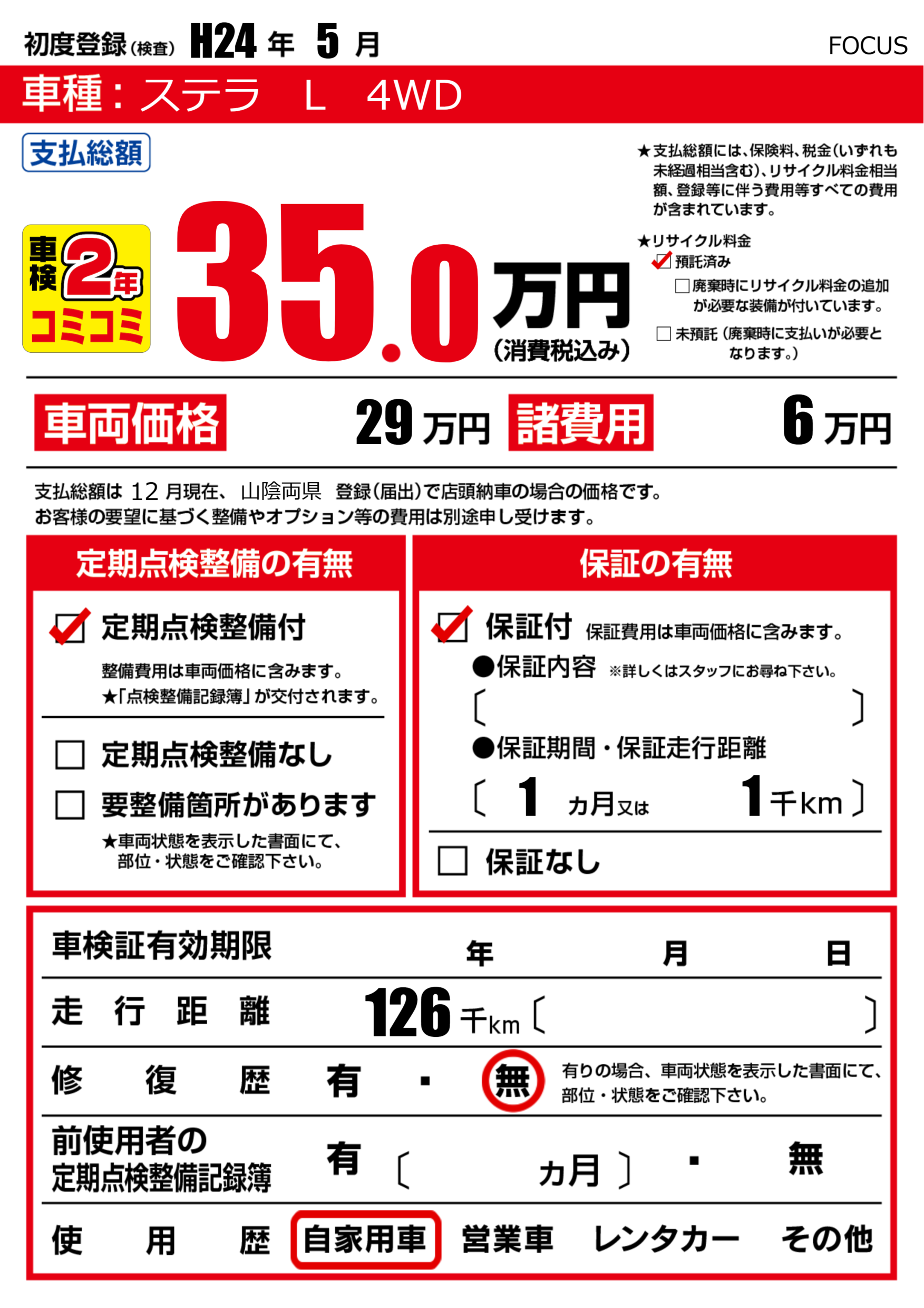 | 走行キロ | 12.6万km | 初年度登録 | H24年5月 |
