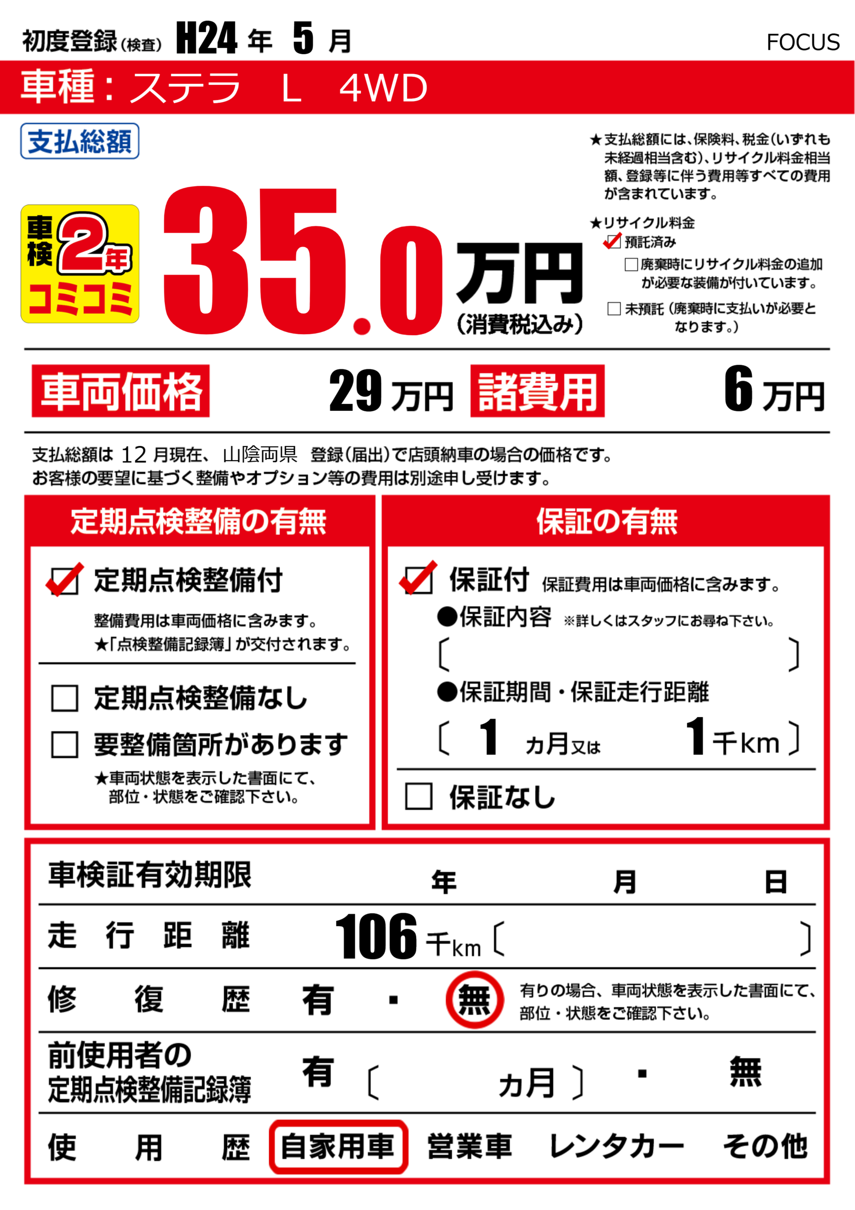 | 車名 | ステラ L 4WD | グレード ミッション 排気量 |