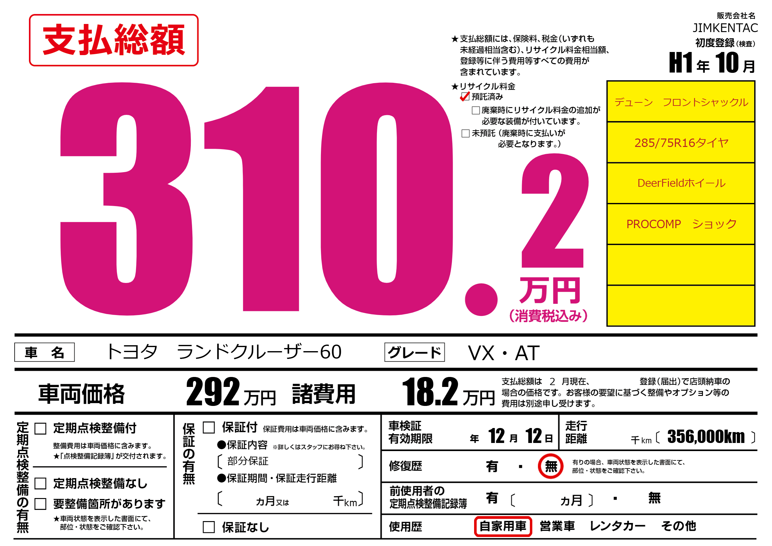 | 車名 | トヨタ ランドクルーザー60 | グレード ミッション 排気量 |