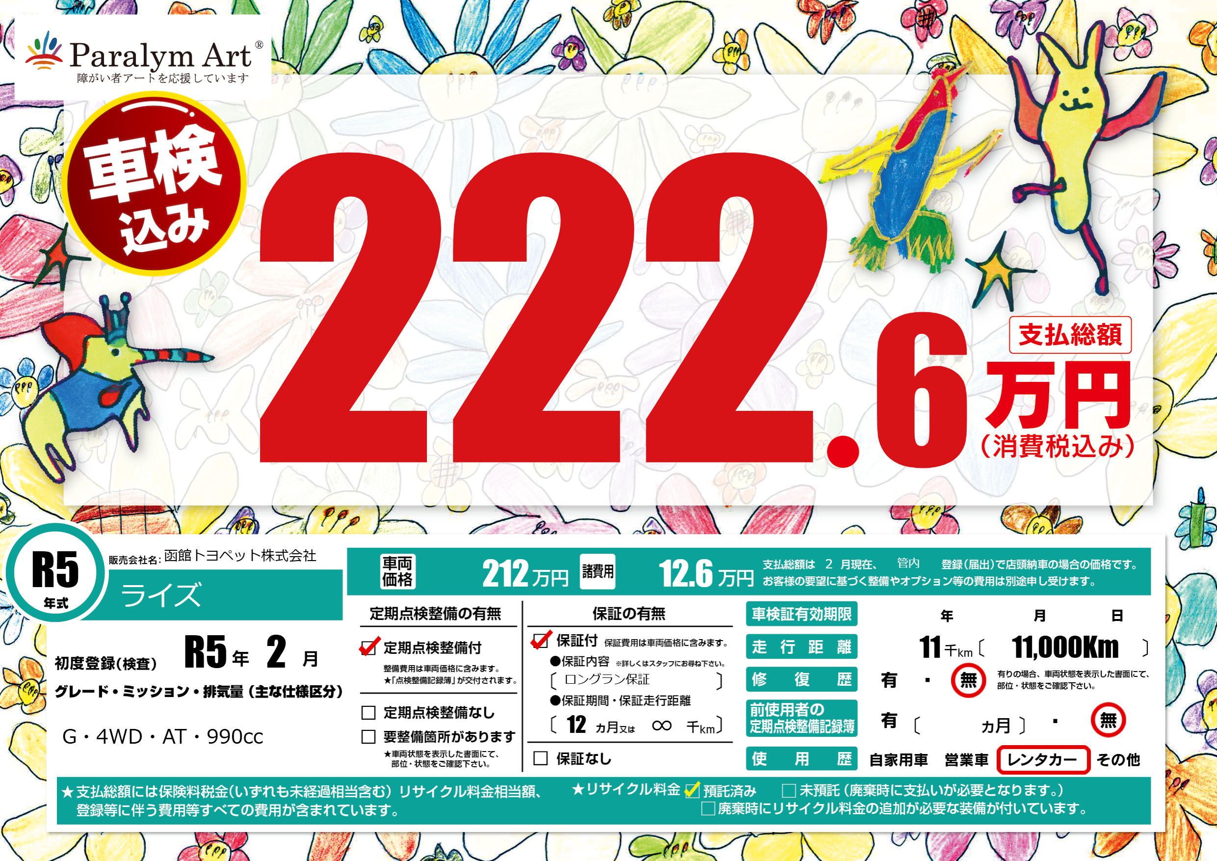 | 走行キロ | 1.1万km | 初年度登録 | R5年2月 |