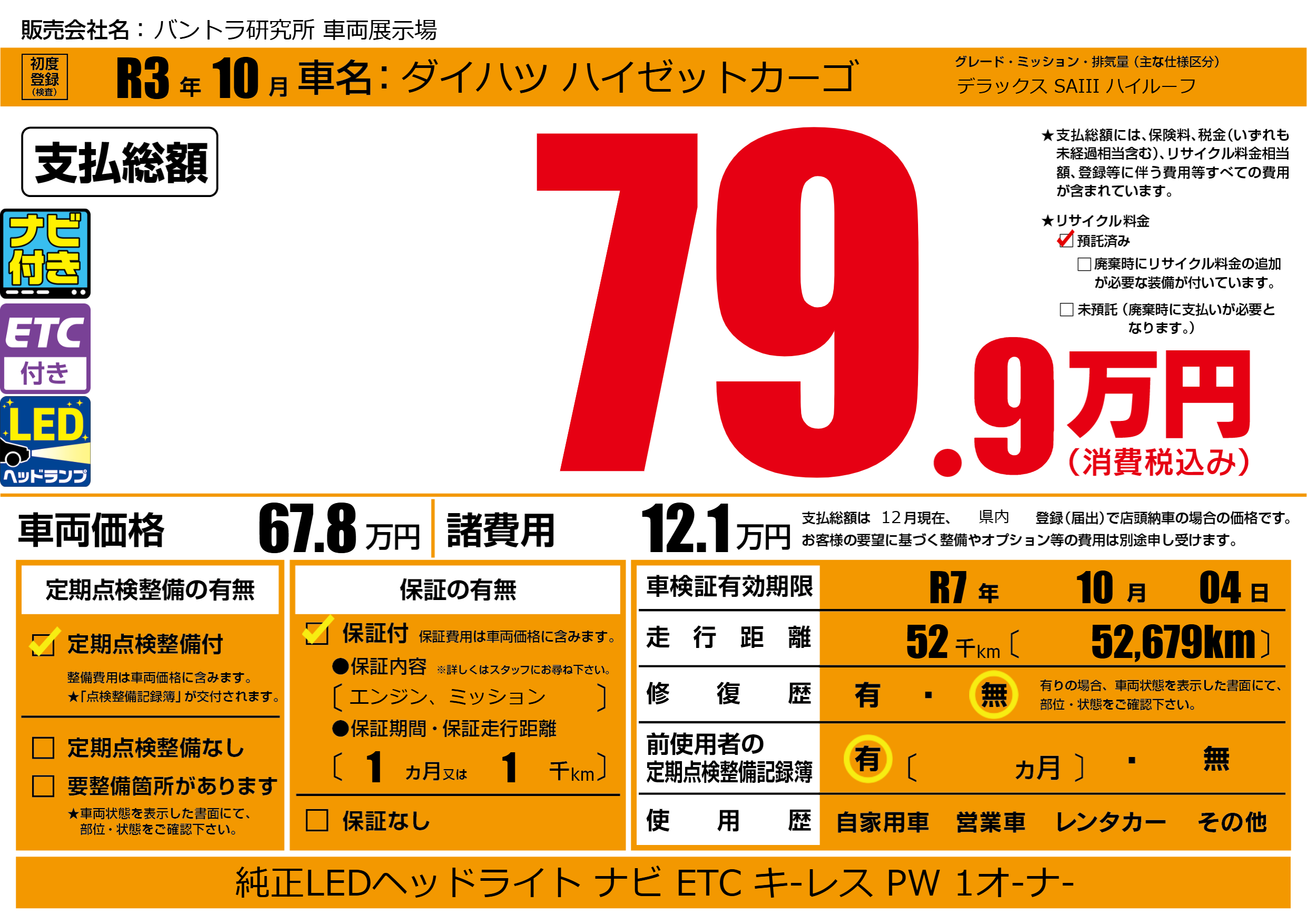 | 車名 | ダイハツ ハイゼットカーゴ | グレード ミッション 排気量 |