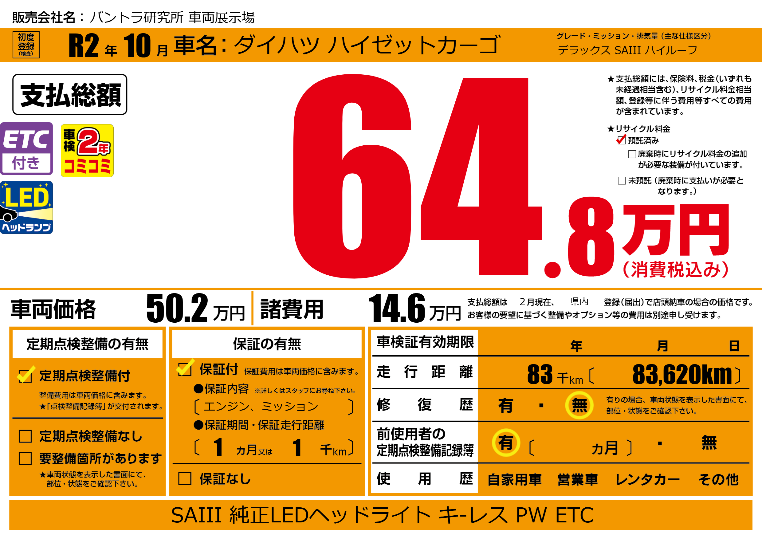 | 車名 | ダイハツ ハイゼットカーゴ | グレード ミッション 排気量 |