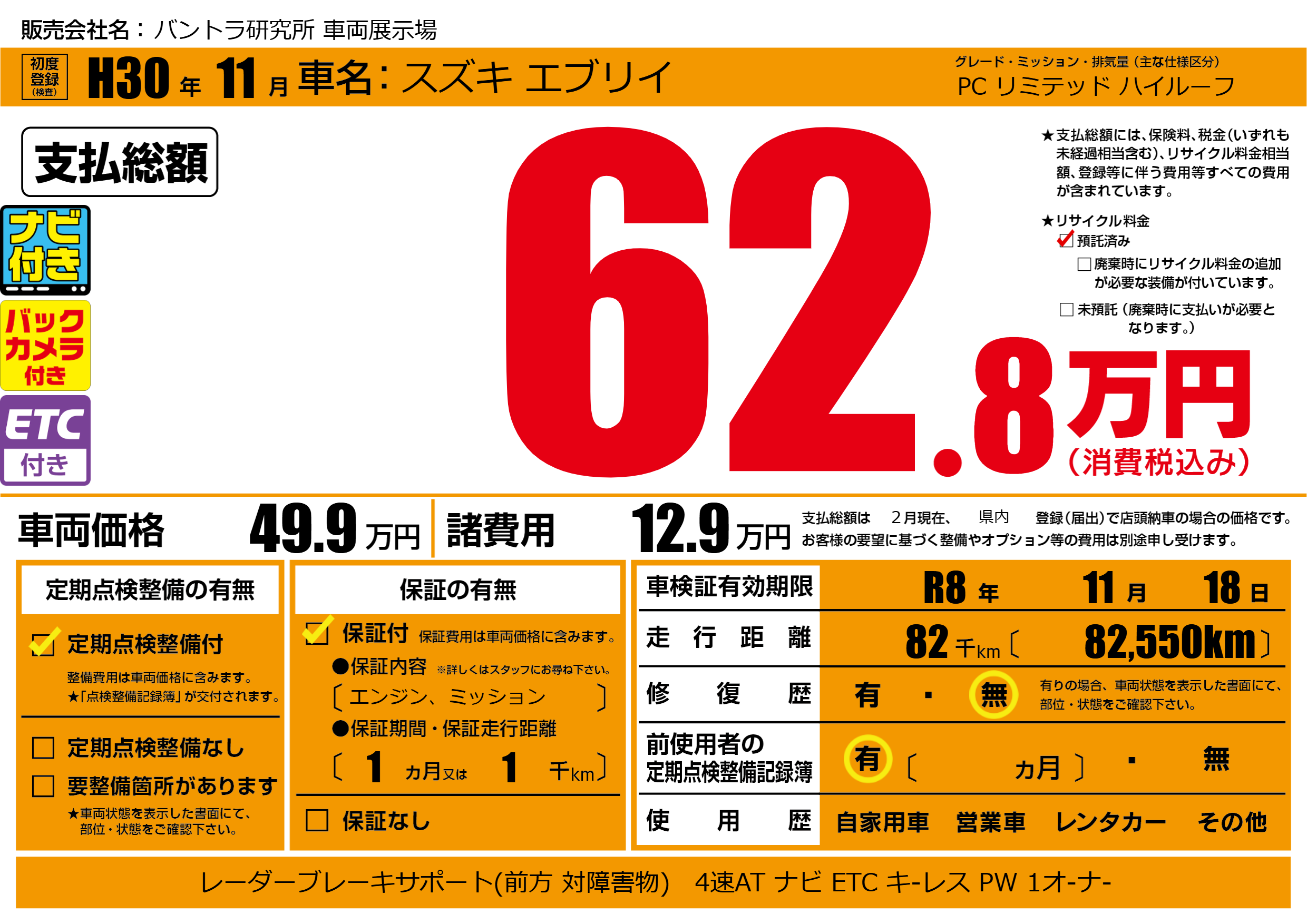 | 車名 | スズキ エブリイ | グレード ミッション 排気量 |