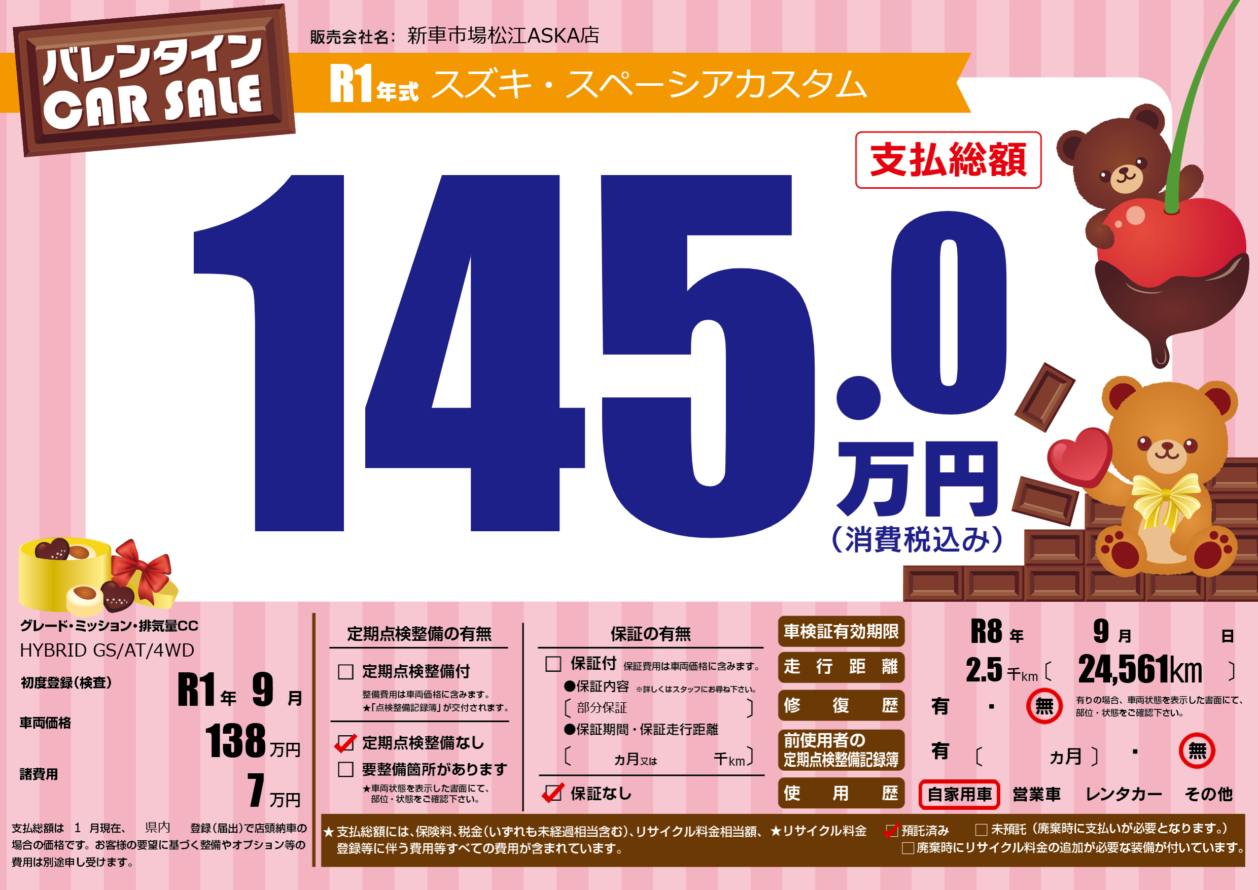 | 車名 | スズキ・スペーシアカスタム | グレード ミッション 排気量 |
