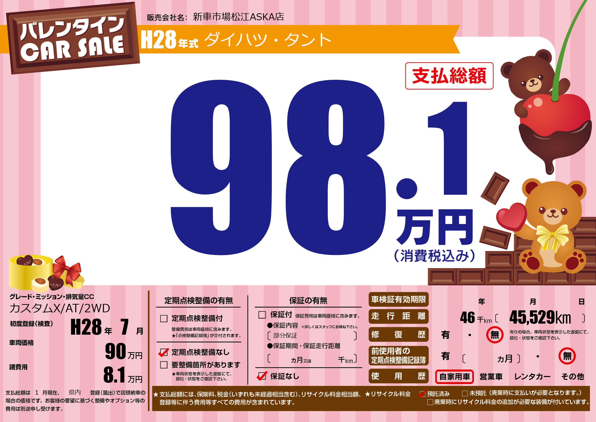 | 車名 | ダイハツ・タント | グレード ミッション 排気量 |