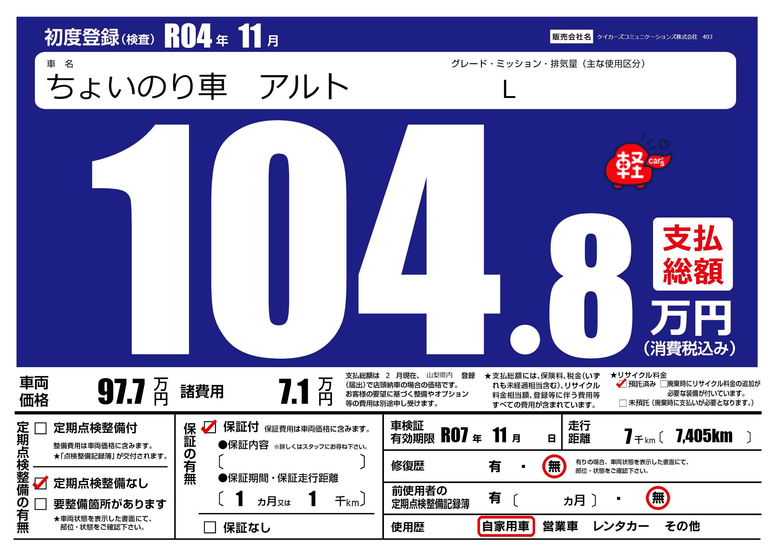 | 車名 | ちょいのり車 アルト | グレード ミッション 排気量 |
