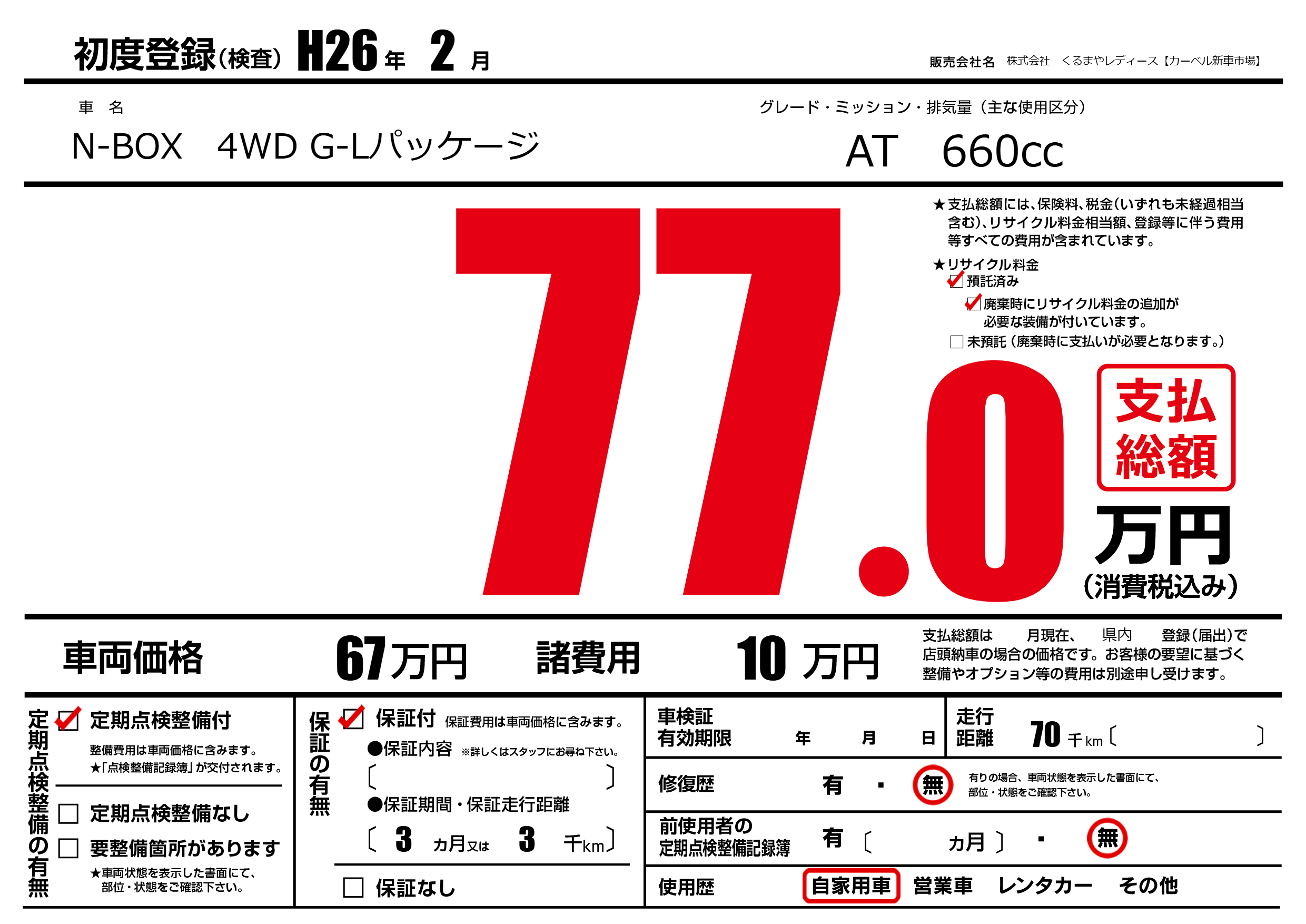 | 車名 | N-BOX 4WD G-Lパッケージ | グレード ミッション 排気量 |