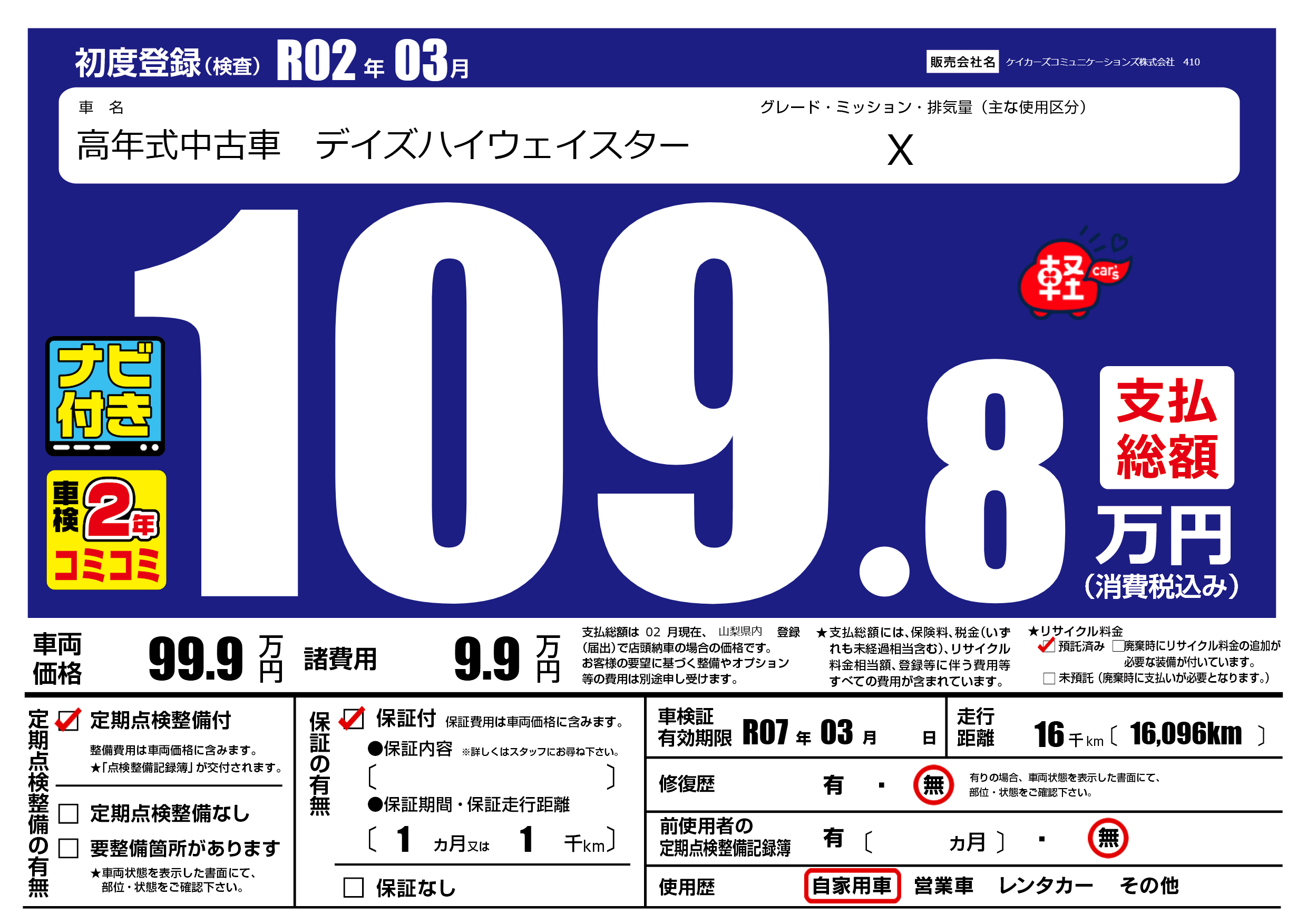 | 車名 | 高年式中古車 デイズハイウェイスター | グレード ミッション 排気量 |