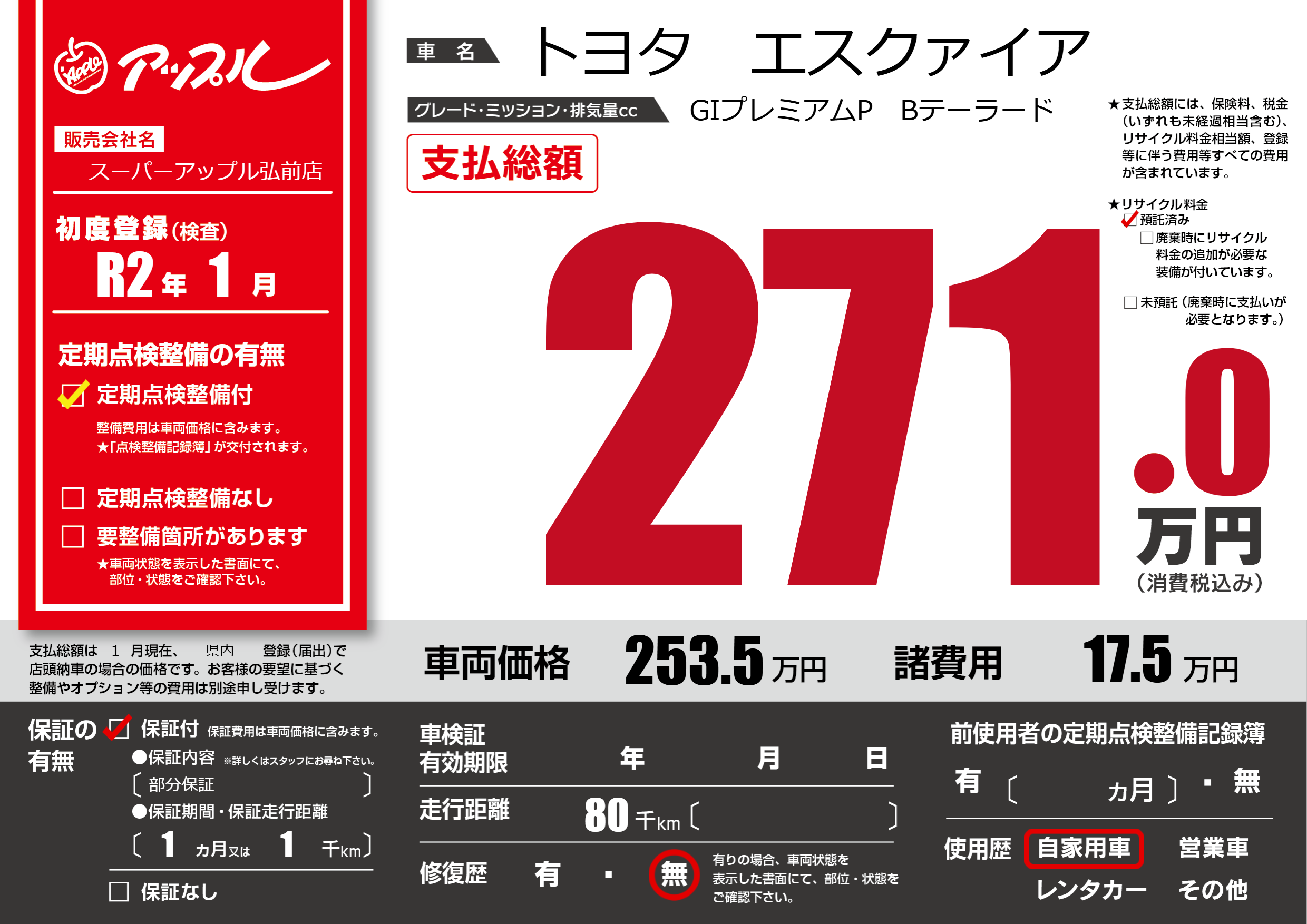 | 走行キロ | 8万km | 初年度登録 | R2年1月 |