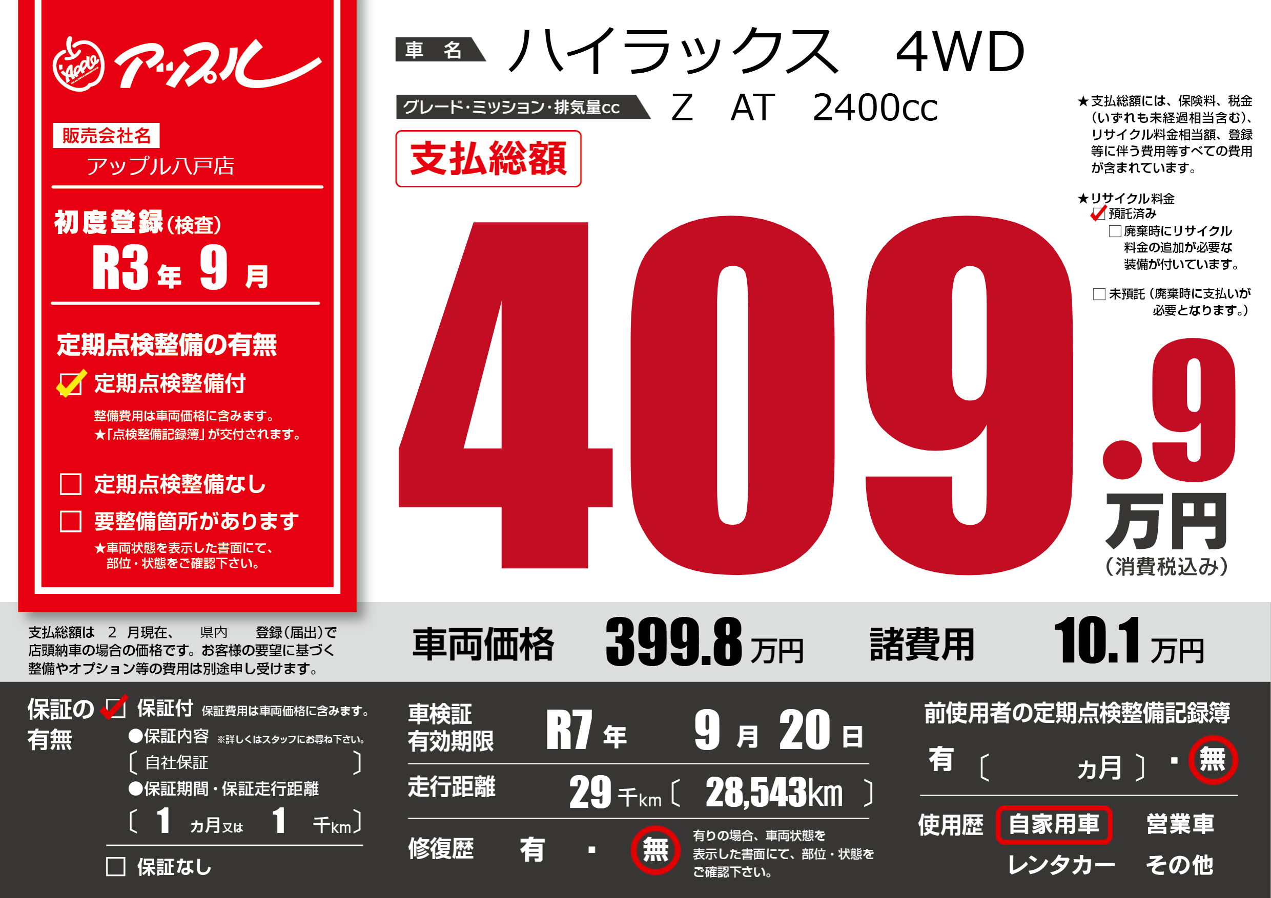 | 車名 | ハイラックス 4WD | グレード ミッション 排気量 |