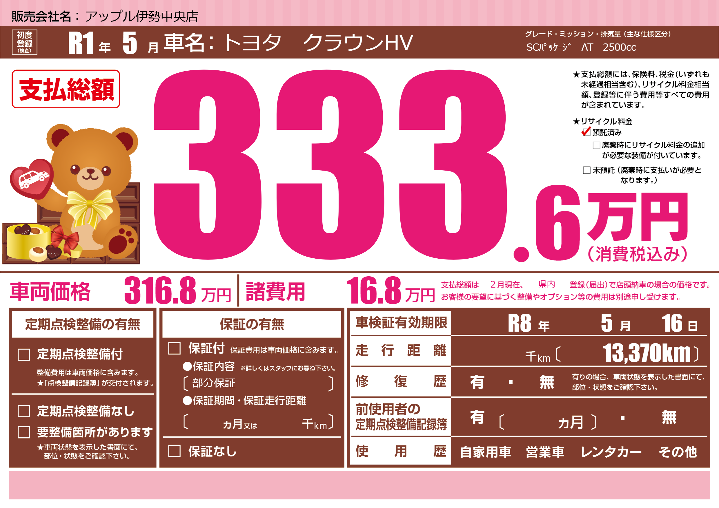 | 車名 | トヨタ クラウンHV | グレード ミッション 排気量 |