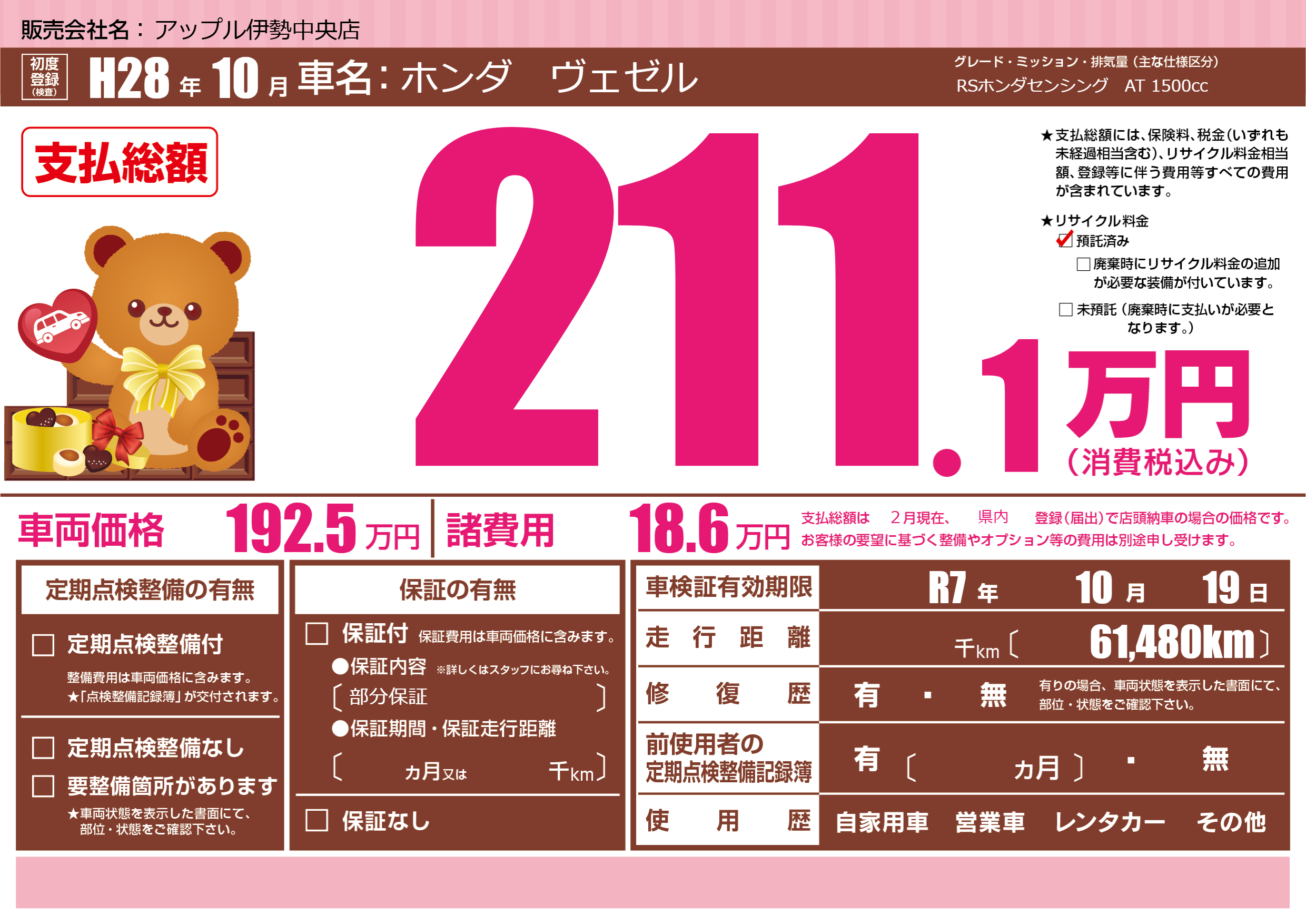 なし | 車検制限 | R7年10月19月 |