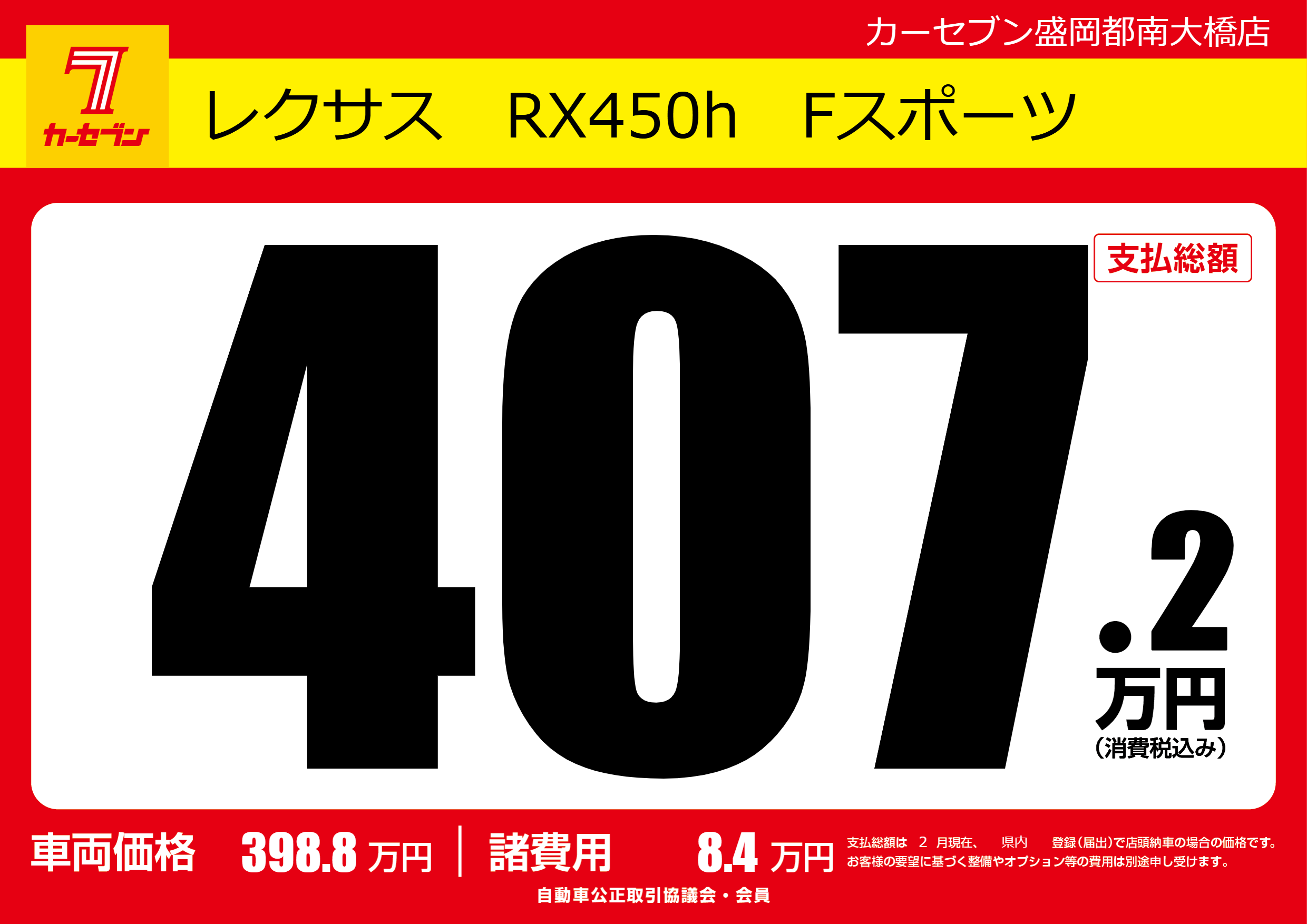 | 車名 | レクサス RX450h Fスポーツ | グレード ミッション 排気量 |