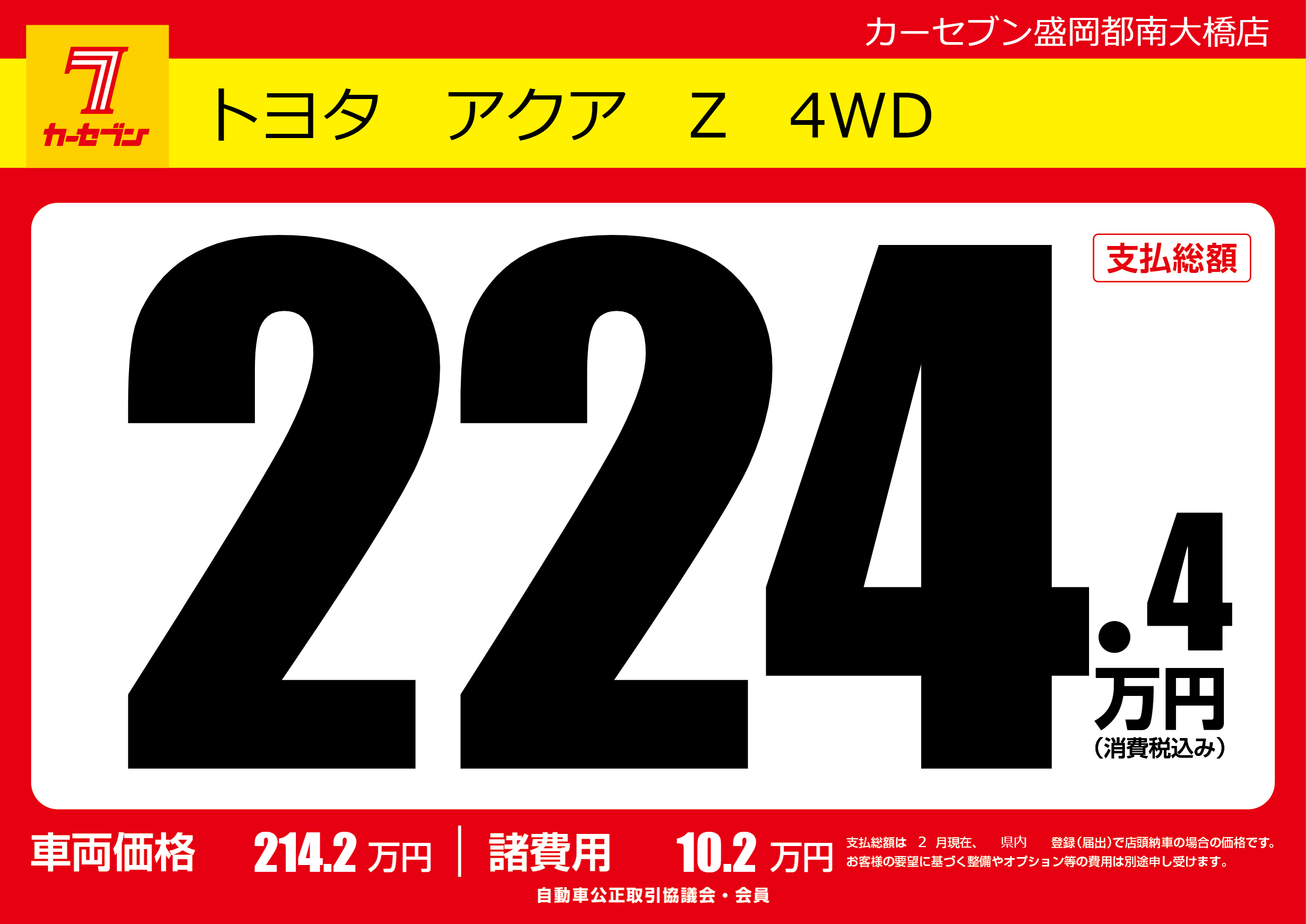 | 車名 | トヨタ アクア Z 4WD | グレード ミッション 排気量 |