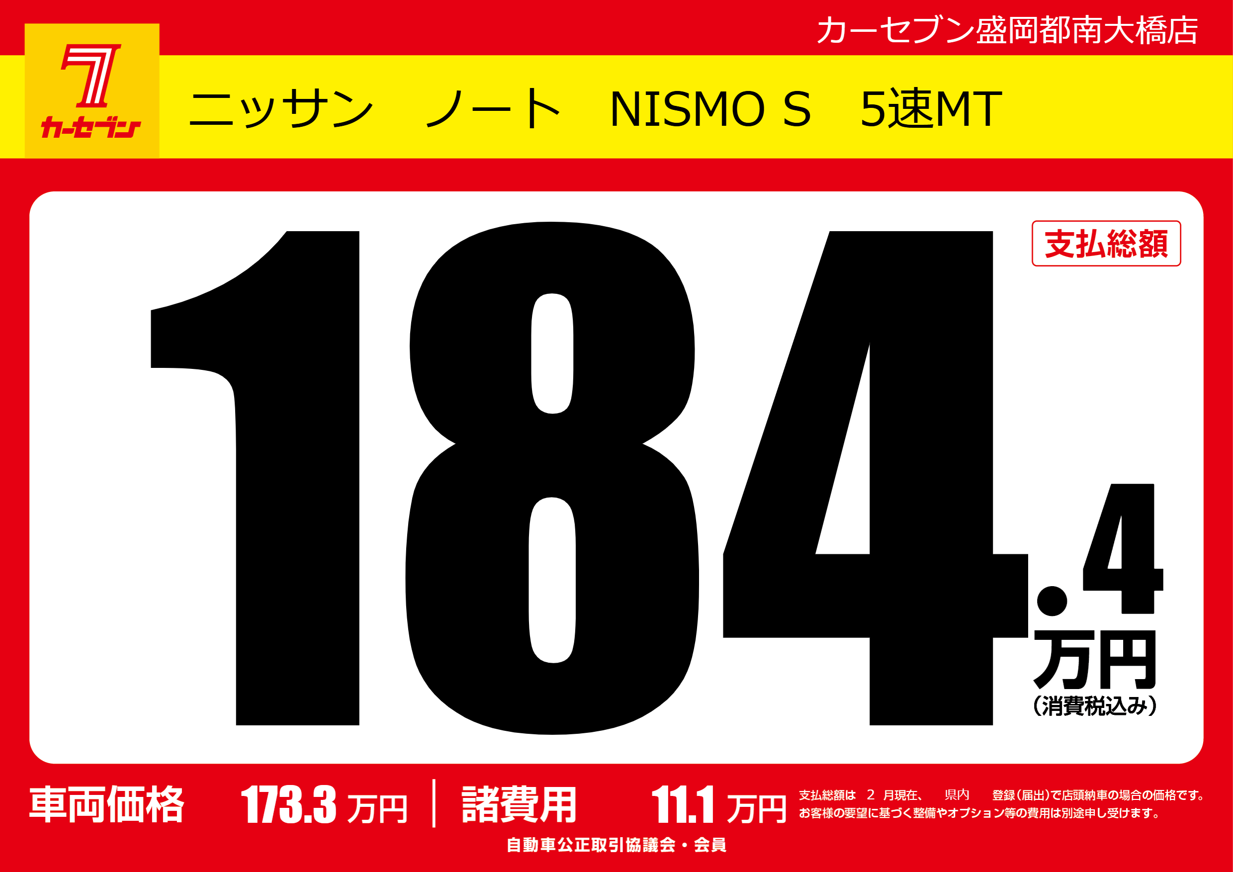| 車名 | ニッサン ノート NISMO S 5速MT | グレード ミッション 排気量 |