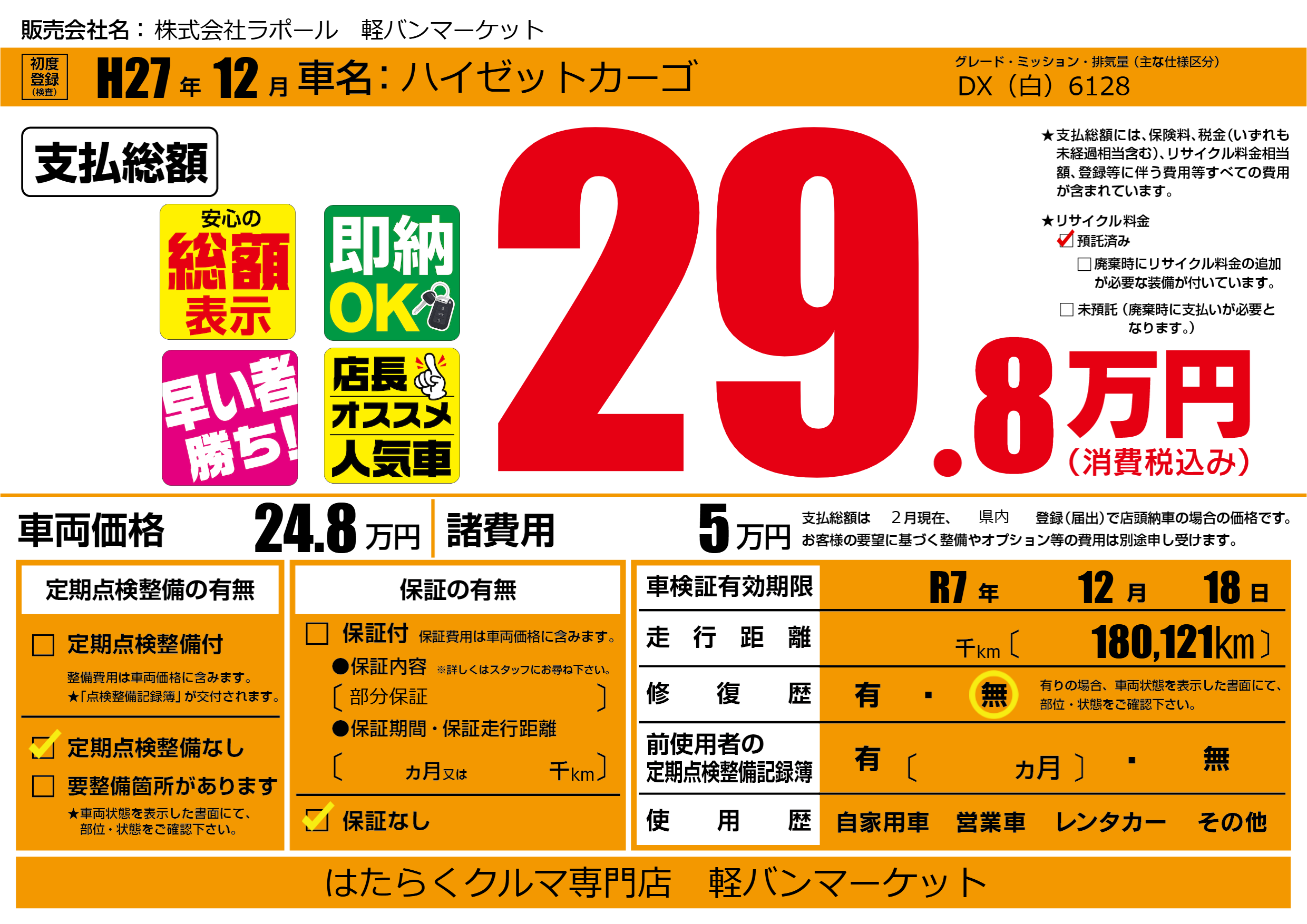 | 車名 | ハイゼットカーゴ | グレード ミッション 排気量 |
