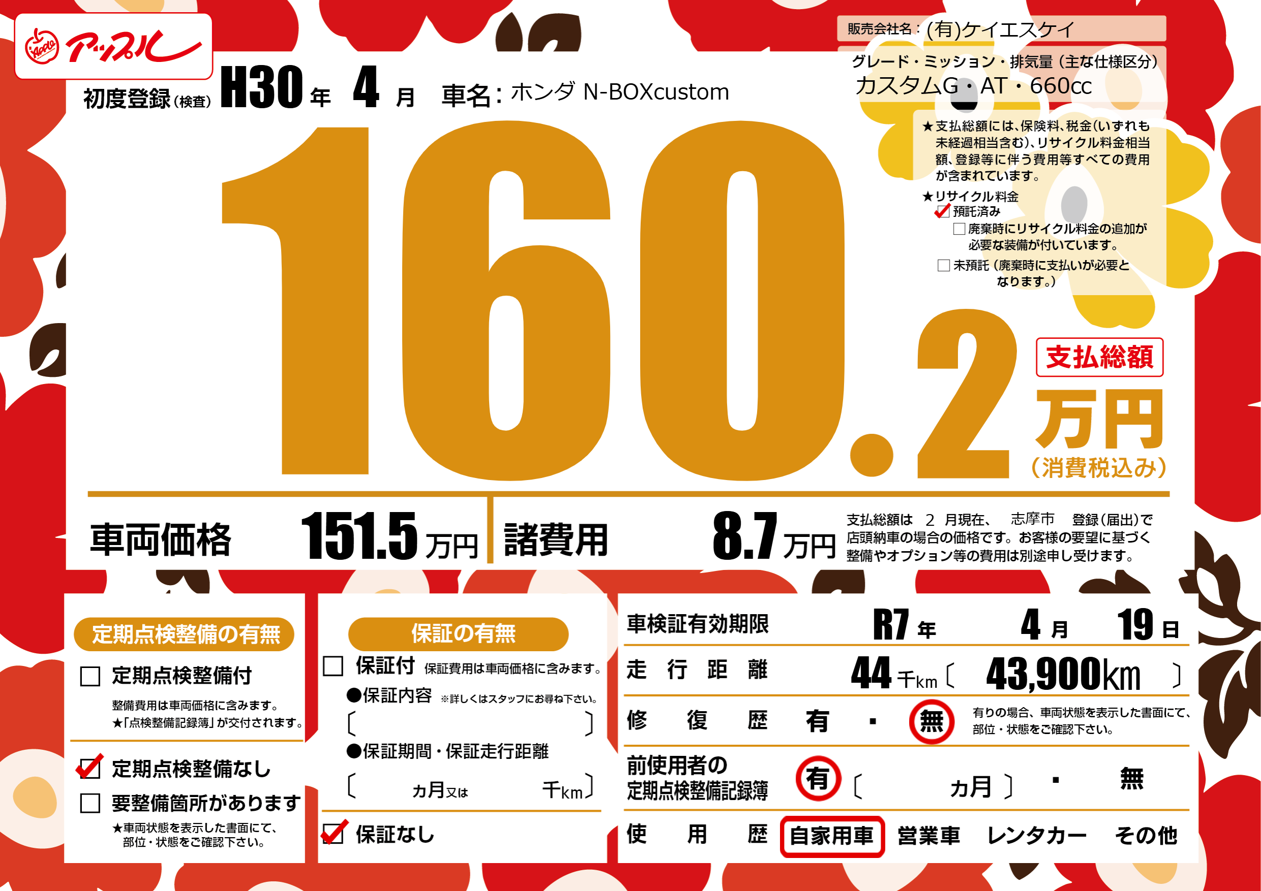| 車名 | ホンダ N-BOXcustom | グレード ミッション 排気量 |