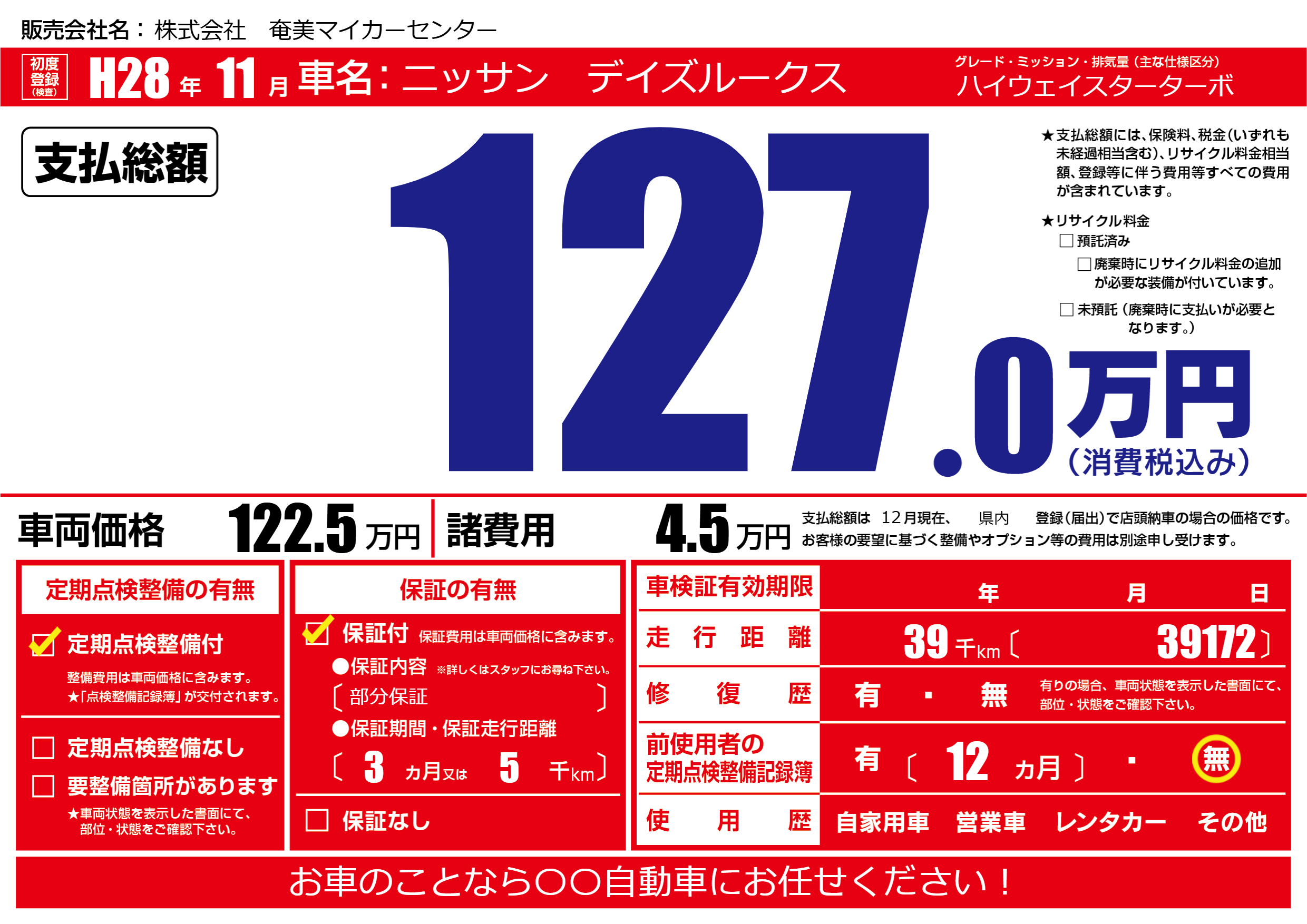 | 車名 | ニッサン デイズルークス | グレード ミッション 排気量 |