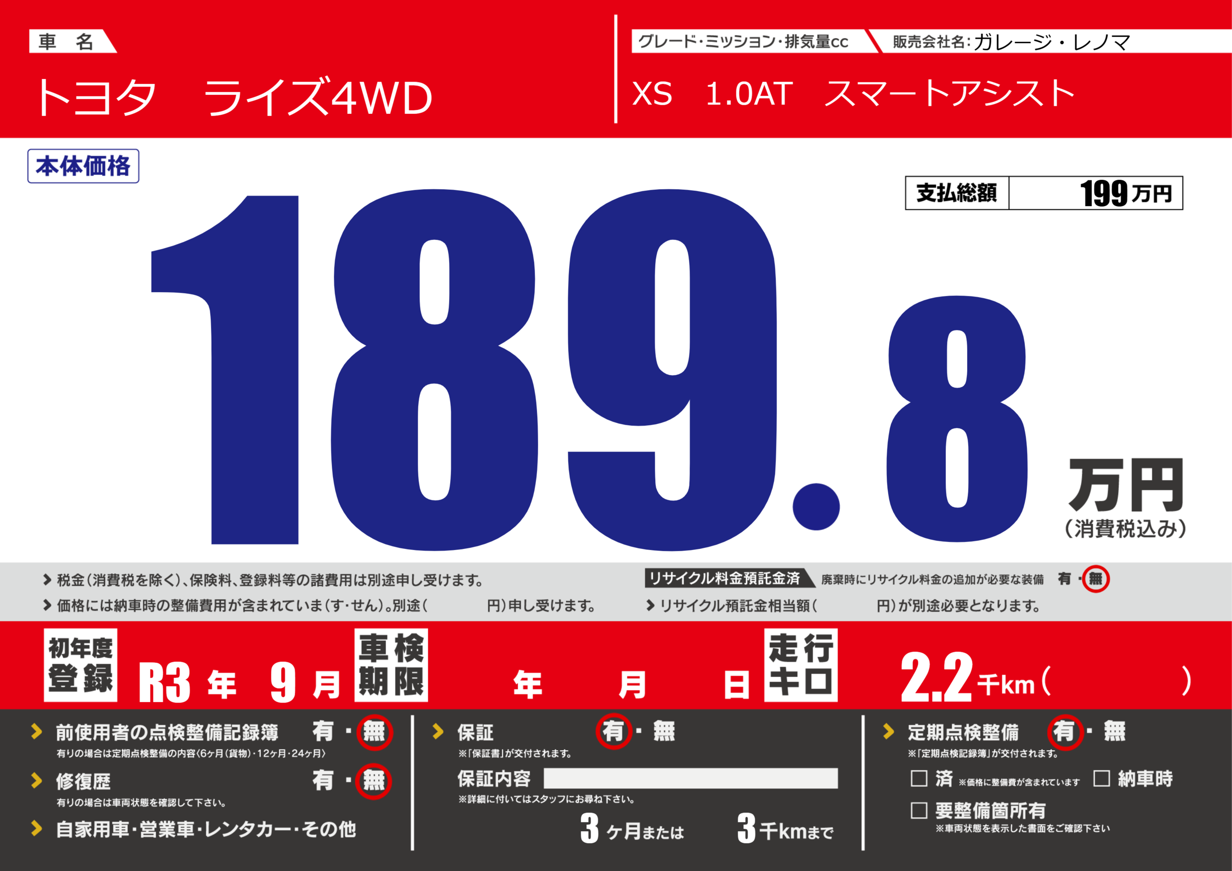 | 車名 | トヨタ ライズ4WD | グレード ミッション 排気量 |