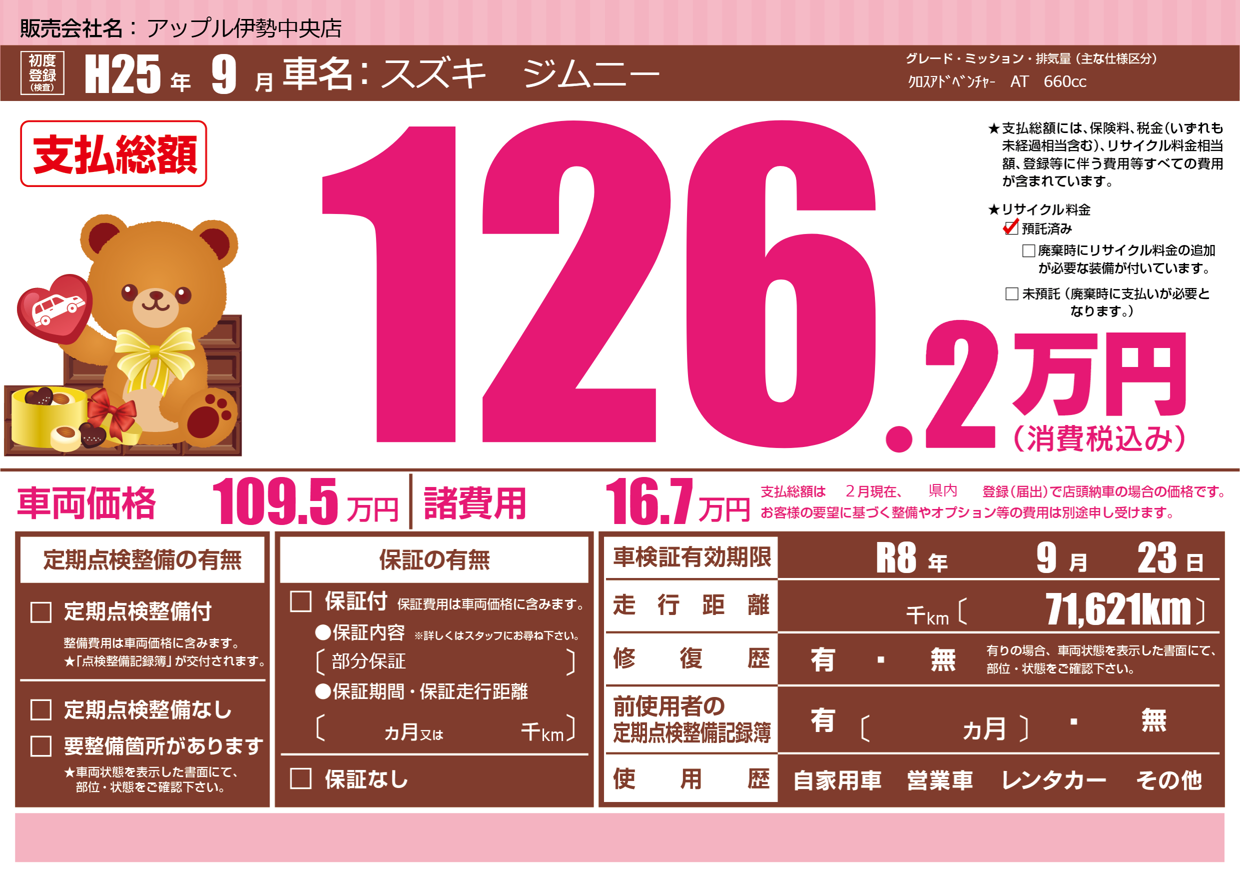| 走行キロ | - | 初年度登録 | H25年9月 |