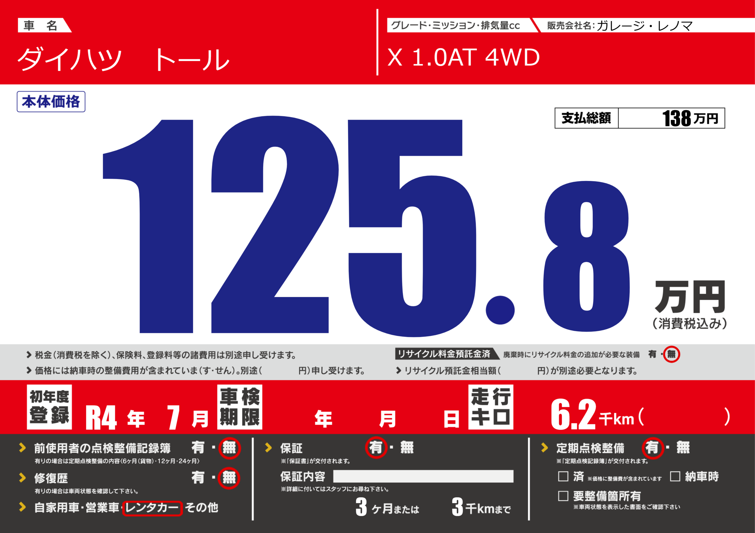 | 車名 | ダイハツ トール | グレード ミッション 排気量 |