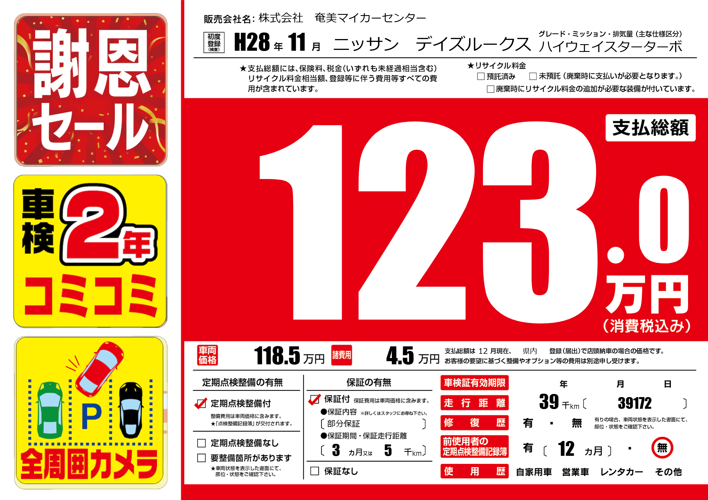 | 走行キロ | 3.9万km | 初年度登録 | H28年11月 |