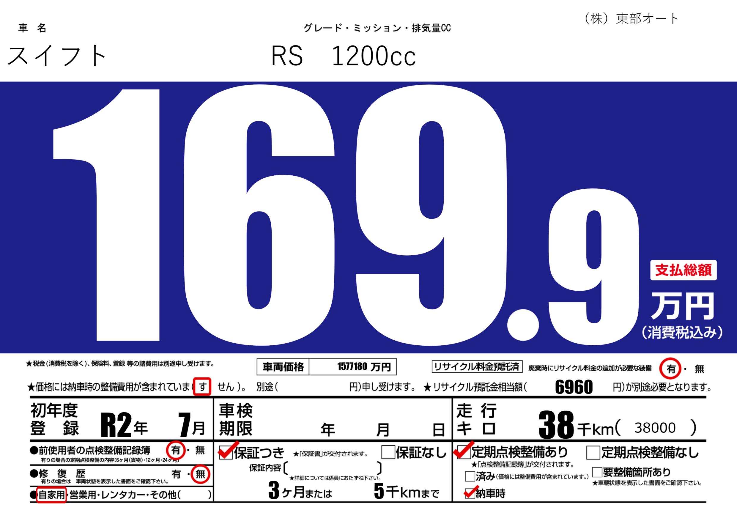 | 車名 | スイフト | グレード ミッション 排気量 |
