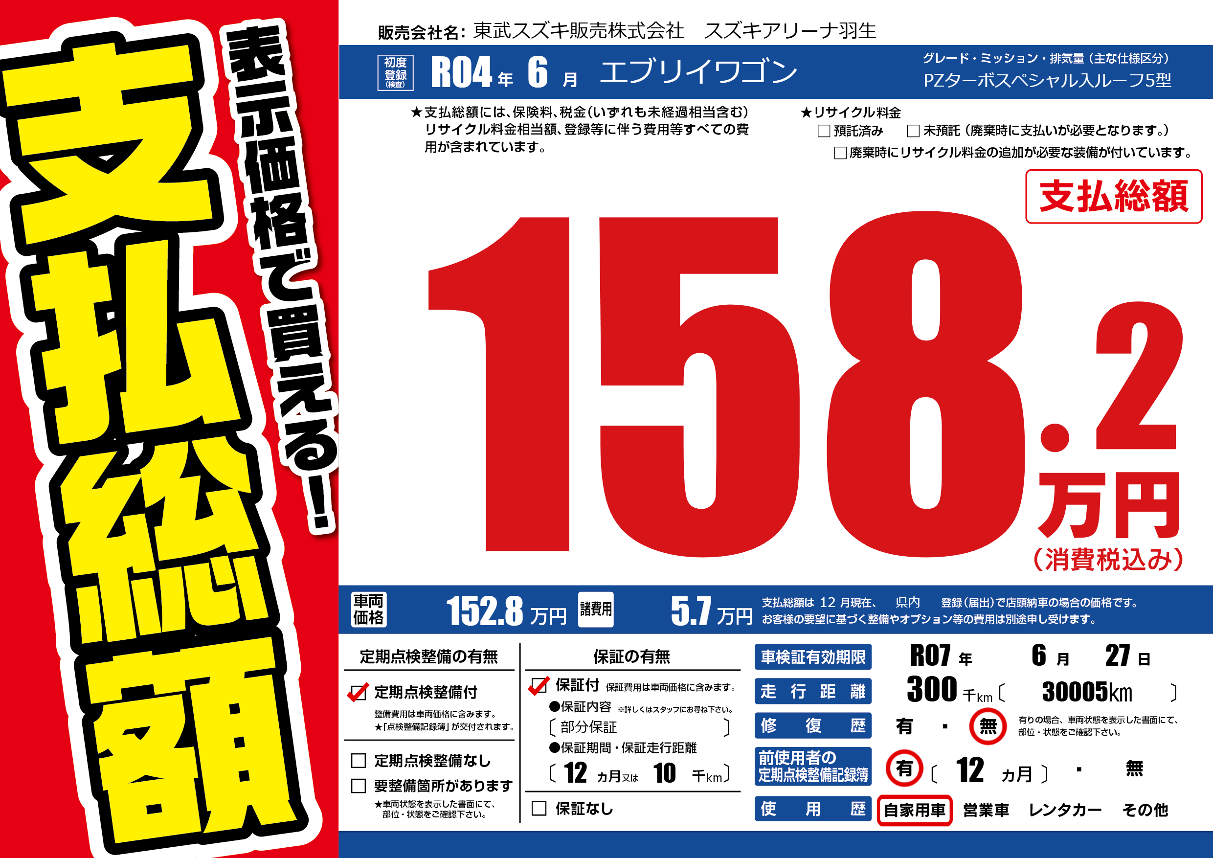 | 車名 | エブリイワゴン | グレード ミッション 排気量 |