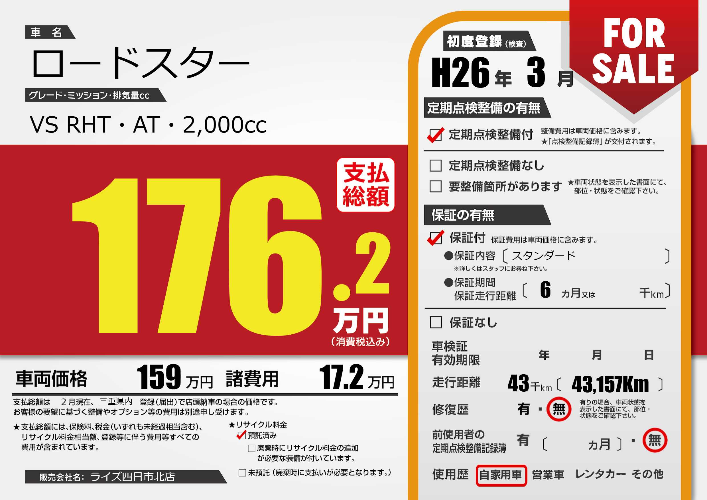 | 車名 | ロードスター | グレード ミッション 排気量 |