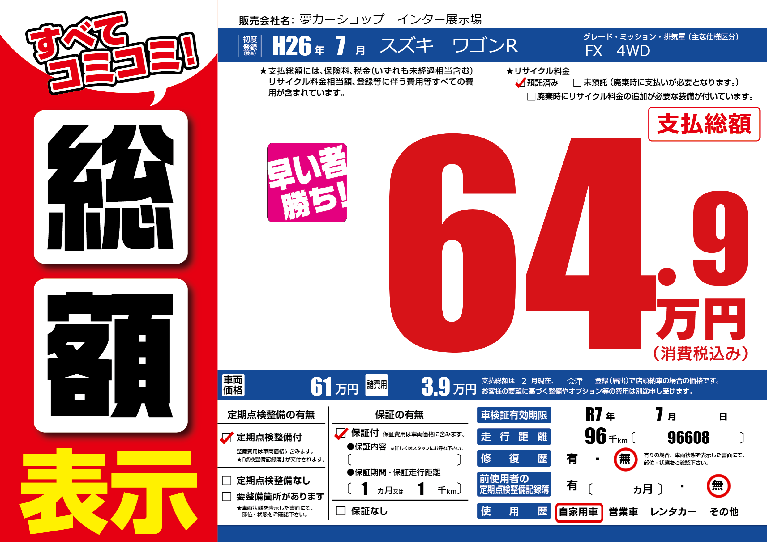 | 車検制限 | R7年 7月 - 日 | ||