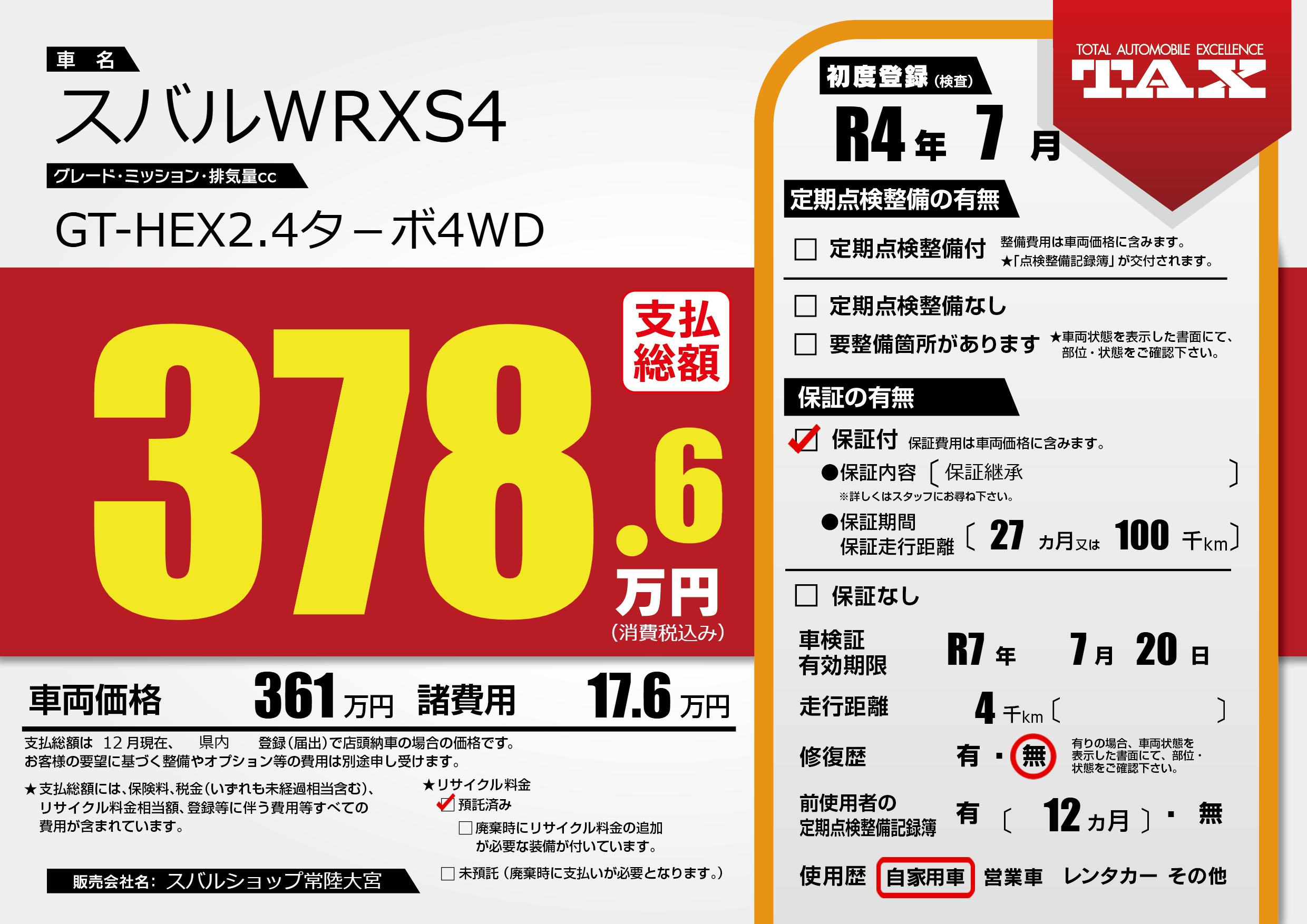 | 車名 | スバルWRXS4 | グレード ミッション 排気量 |