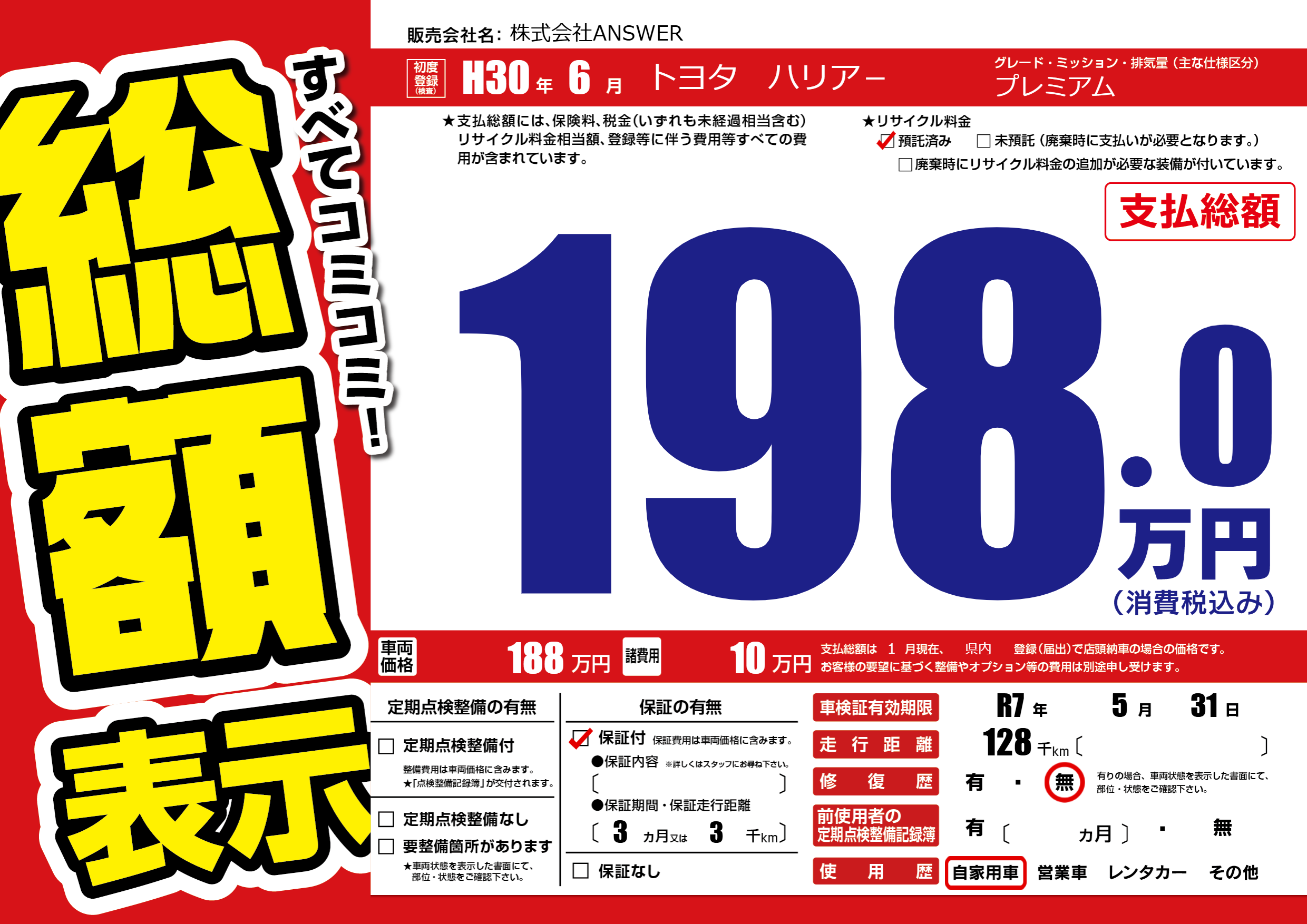 | 走行キロ | 12.8万km | 初年度登録 | H30年6月 |