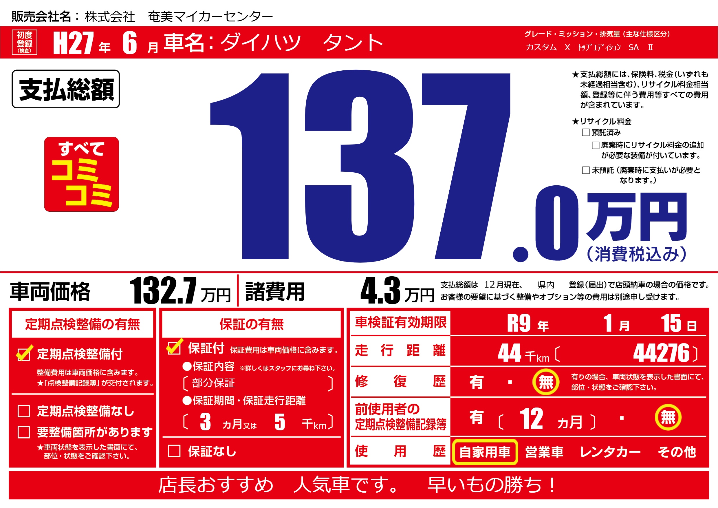 | 走行キロ | 4.4万km | 初年度登録 | H27年6月 |
