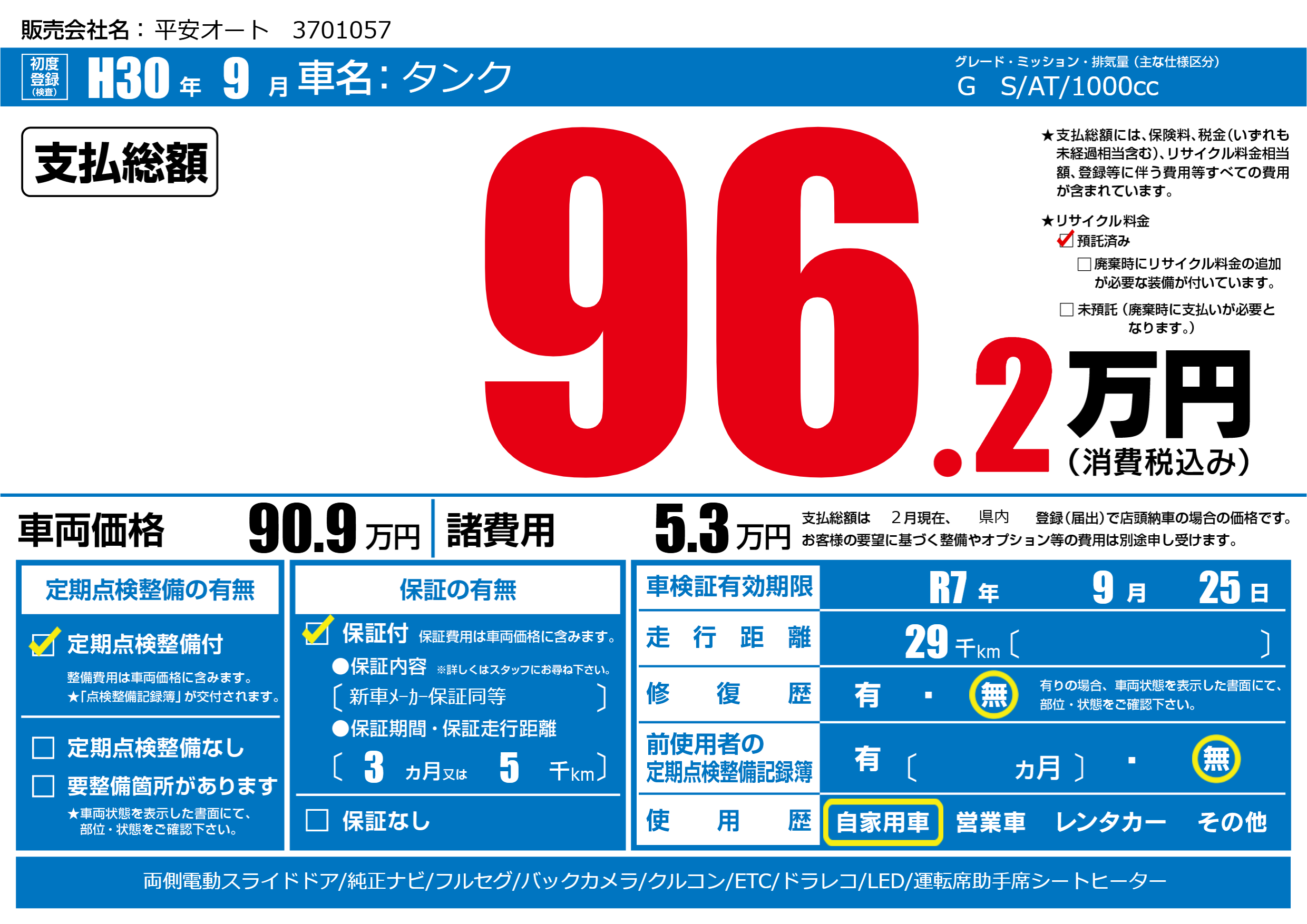 | 走行キロ | 2.9万km | 初年度登録 | H30年9月 |