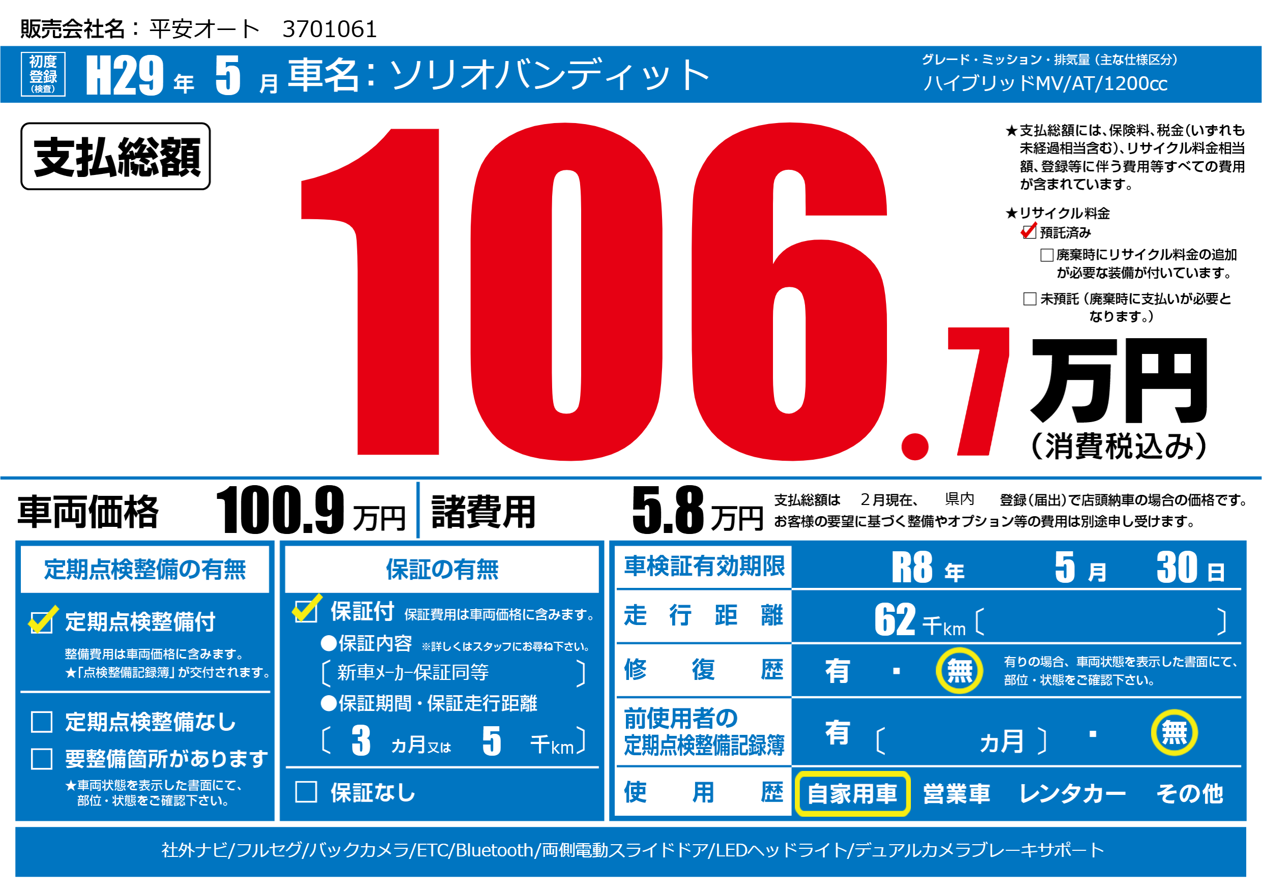 | 車名 | ソリオバンディット | グレード ミッション 排気量 |