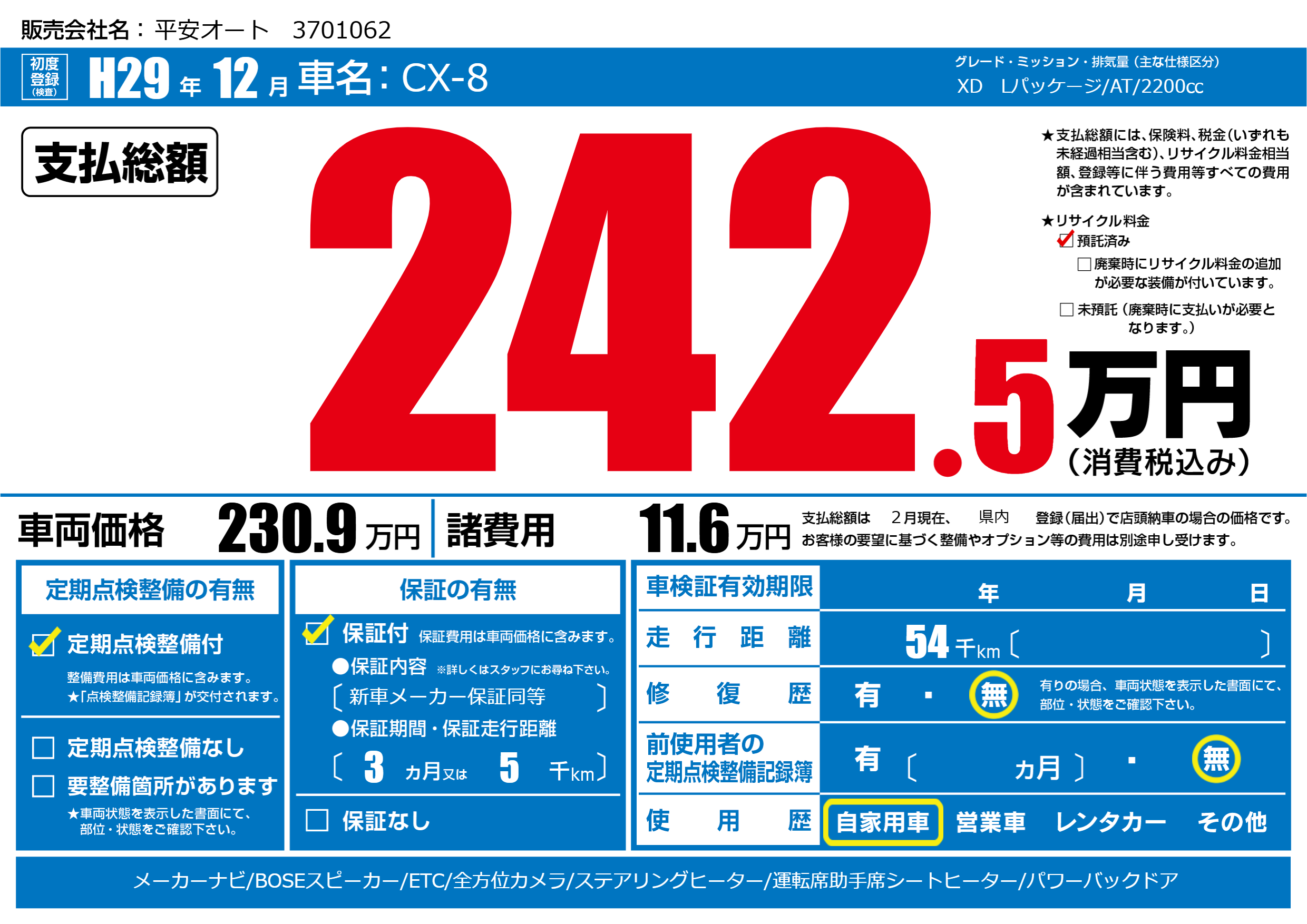 | 車名 | CX-8 | グレード ミッション 排気量 |